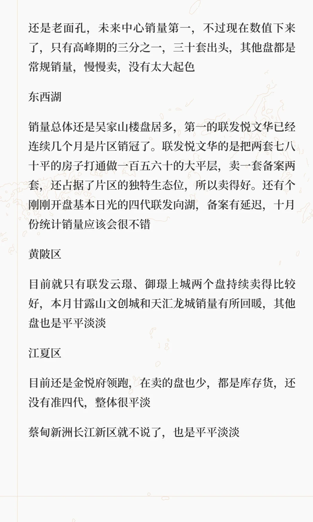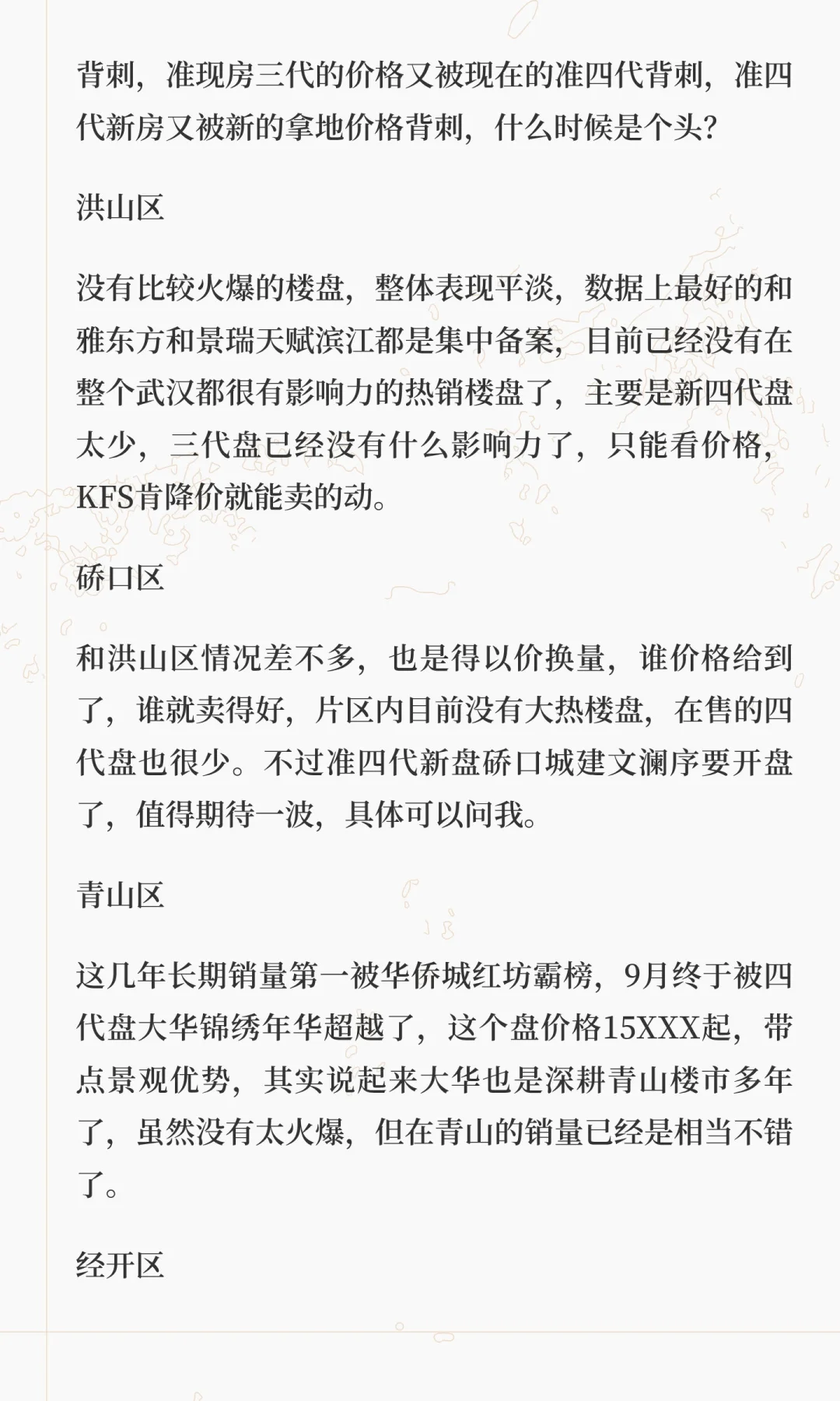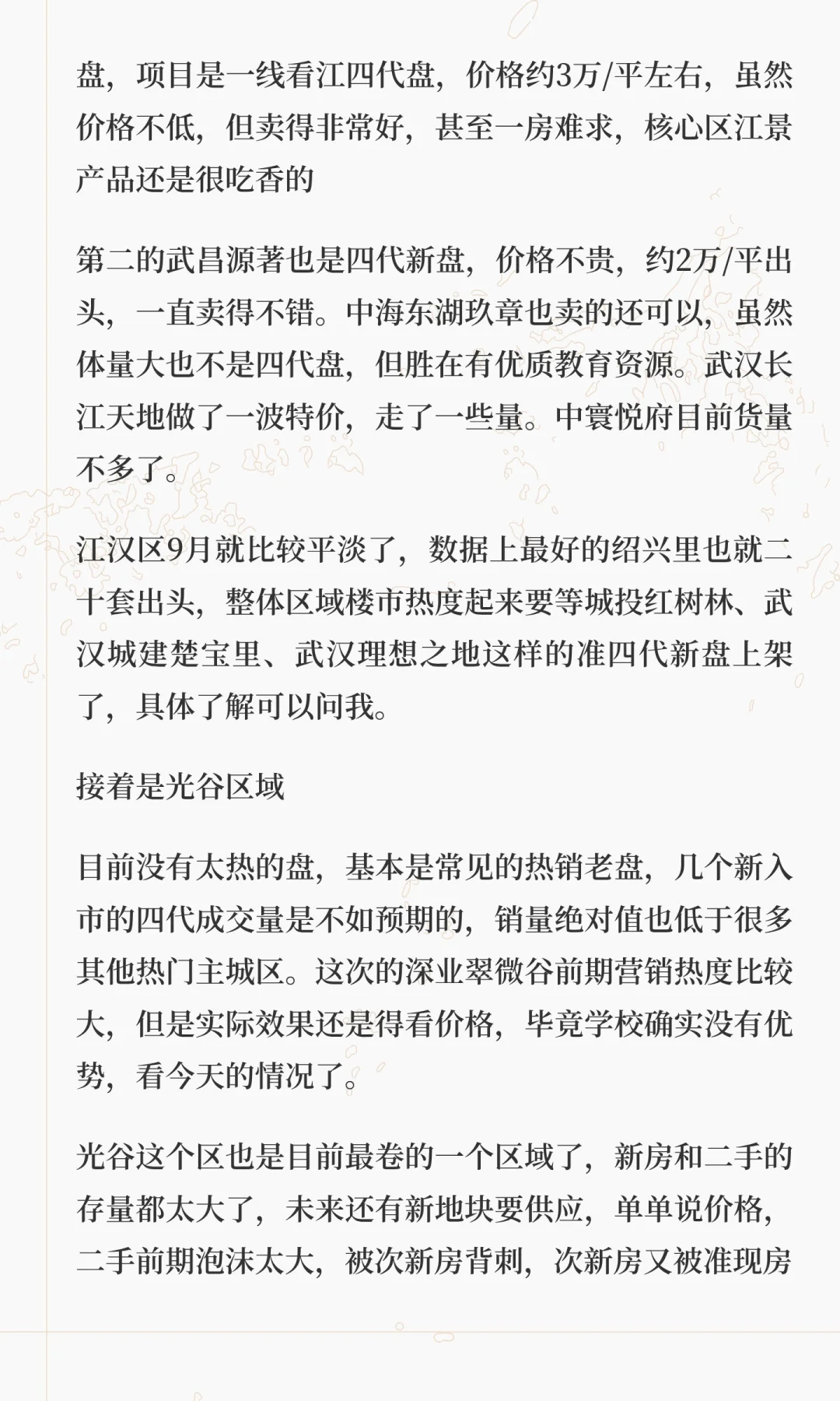 整体来说,目前武汉楼市筑底还没有完全形成,虽然政策面和住房贷款方面依然有支持,但是库存量大,需求端信心不足,和整个经济的形势也息息相关,要想卖的好,要么地段好资源稀缺,要么就实实在在把价格打到底凭价格取胜,作为刚需购房者目前的主要方向依然是多看多比较,明确自己的购房需求,尽量选择满足自己需求的板块和楼盘,如果不知道怎么选择板块或者对楼盘的优劣势不太了解的,可以问我
