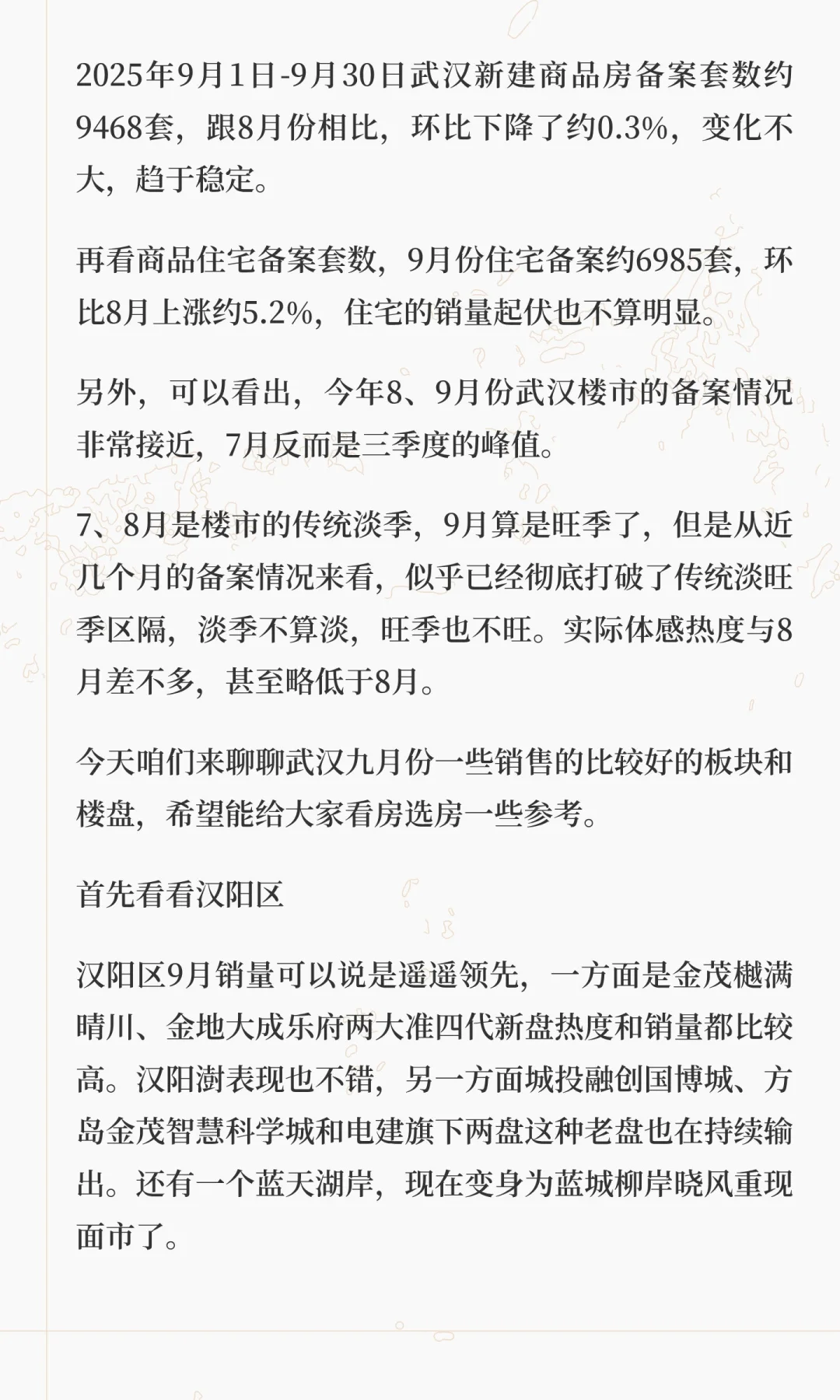 2025年9月武汉新建商品房备案套数约9468套,环比微降0.3%,住宅备案6985套,环比上涨5.2%。汉阳区表现突出,江岸区福星惠誉铂雅府热销,武昌区江南岸四代盘表现亮眼,其他区域整体平淡。