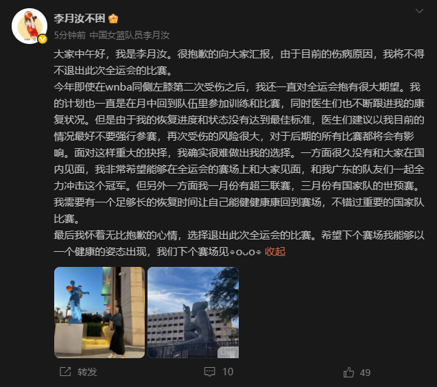 李月汝自宣退出全运会。。。。。。原因是之前在wnba出现的左膝伤病还没好透,只能