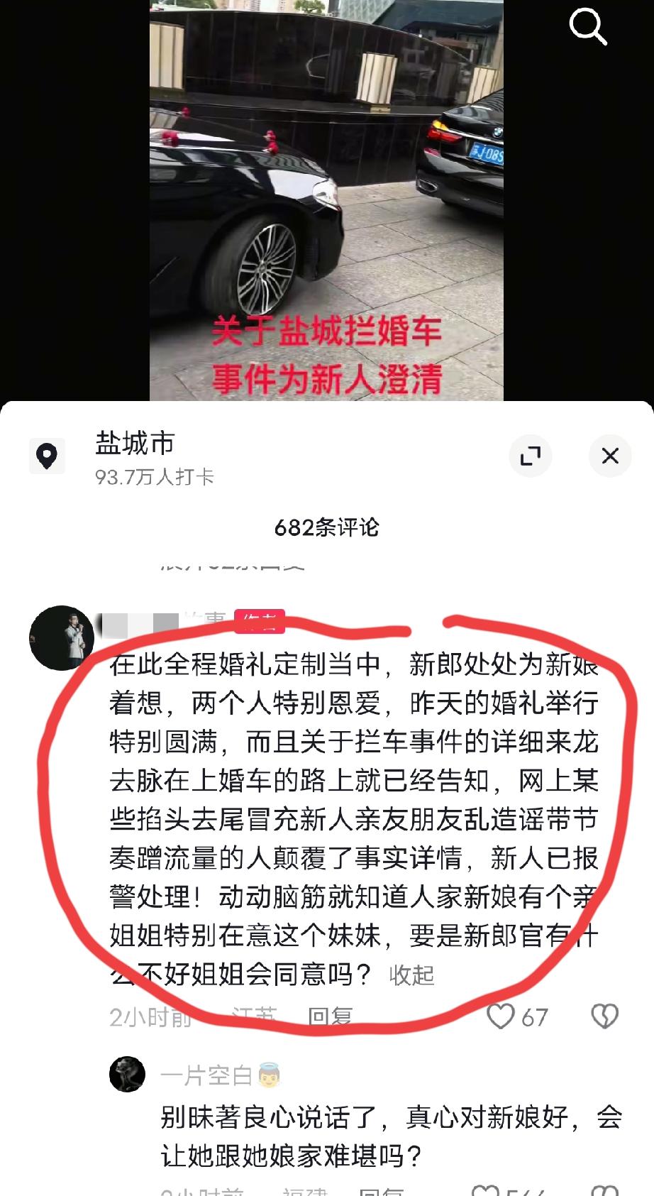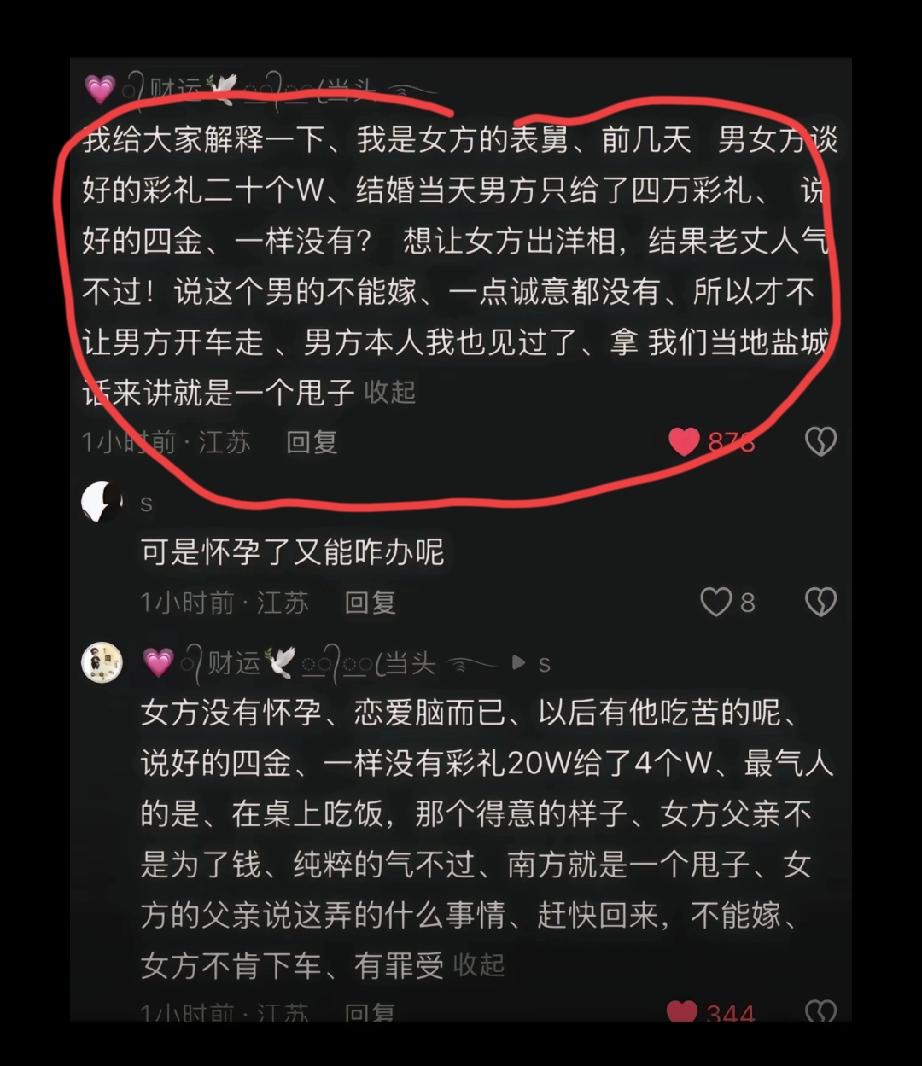 江苏盐城。新娘父亲拦着婚车不让走。网传是谈好的彩礼20万,结婚当天只给4万,说好