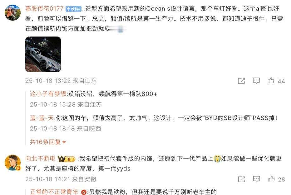 参考官方配置调研信息,用户对新款海豹关注度较高的配置为尾翼、高级外饰材料(如碳纤维、哑光漆等)、无框车门等,此外也有用户建议新车造型方面采用比亚迪 Ocean-S 概念车的设计。
