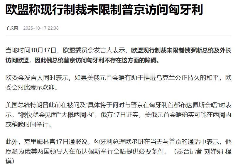 欧盟紧急为普京开绿灯,允许其专机飞入欧洲领空,令制裁成为一个笑话! 10月17日,欧盟委员会公开表示,目前对俄罗斯的制裁清单里,并没有禁止普京和拉夫罗夫这类国家高层访问欧盟的条款,这就意味着普京要去匈牙利布达佩斯参会完全没问题。 早在2023年,国际刑事法院就以所谓"战争罪"为由给普京发了逮捕令,按照这个法院的《罗马规约》,所有成员国都得履行逮捕义务。欧盟27国都是这个规约的成员国,按理说必须遵守,但这次却直接绕开了这个规定。 欧盟给出的解释是"制裁清单没写不让国家元首公务访问",这种说法其实很牵强——毕竟逮捕令是独立的法律文件,效力并不比制裁条款低,明眼人都能看出这是在找借口。 而这一切的背后,美国的态度起到了关键作用。这次普京和特朗普的会面是特朗普亲自搞定的,这也是他和普京继阿拉斯加会面后的第二次碰面。 而欧盟作为美国的传统盟友,在这种涉及美国核心外交计划的事情上,自然不敢唱反调。要是因为执行逮捕令把美国的会面计划搅黄了,反而会影响欧美之间的关系,所以欧盟才会在"法律"和"盟友情面"之间选择了后者,做出这种明显妥协的决定。 这种把政治利益放在法律义务之上的做法,也让外界看清了制裁背后的双重标准。 其实这种妥协早就不是第一次了,它暴露了欧盟对俄制裁体系本身就存在很大漏洞。 自从冲突爆发以来,欧盟虽然搞了十几轮对俄制裁,从能源贸易到科技合作几乎全覆盖,但这些制裁从来都不是"一刀切"的。比如涉及老百姓日常生活的商品往往会网开一面,到了政治外交这种关键场合更是弹性十足。 就像之前俄罗斯外长拉夫罗夫去欧洲参加联合国相关会议时,欧盟也没提执行逮捕令的事。这种选择性执行的做法,让制裁的严肃性越来越弱,大家慢慢发现这些规定更像是"看人下菜碟"的工具。 更重要的是,欧盟内部在这件事上本来就意见不一。像波兰、波罗的海三国这些中东欧国家,对俄罗斯态度强硬,纷纷表示反对普京入境,觉得这违背了欧盟一直标榜的价值观;但德国、法国这些核心大国想得更实际,它们担心彻底搞僵和俄罗斯的关系会影响地缘政治平衡,也不想失去外交谈判的空间,所以更倾向于放行。 这种内部的分歧让制裁政策很难形成统一立场,执行起来自然是松一阵紧一阵。 而当制裁成为可以根据政治需要随意调整的工具时,其威慑力自然会不断流失,最终沦为国际社会眼中的"笑话"。