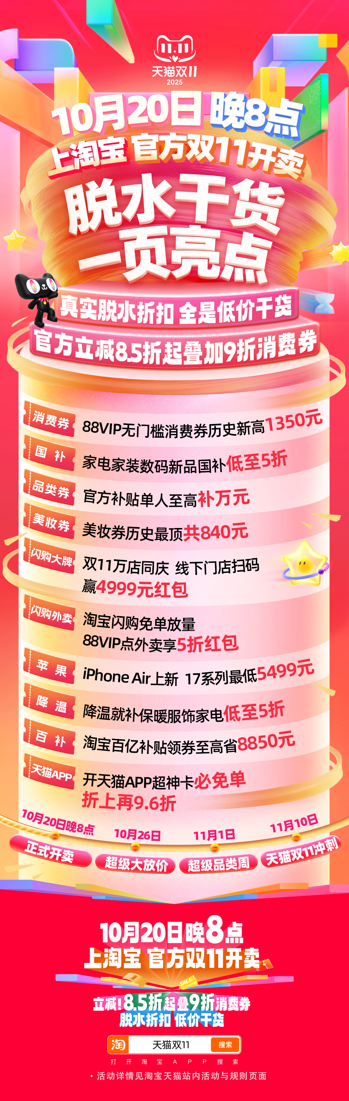 #双11付尾款# 今晚8点,尾款通道已全面开启!天猫双11搞的就是没套路,搞的就是脱水价!官方立减8.5折起叠9折消费券,全是干货,没有水分。平台与商家联手让利,用透明低价回应理性消费,让你买得明白、省得彻底。现在上淘宝搜索“天猫双11”,付款不犹豫,优惠不等人!