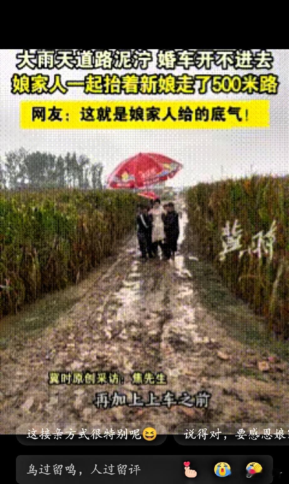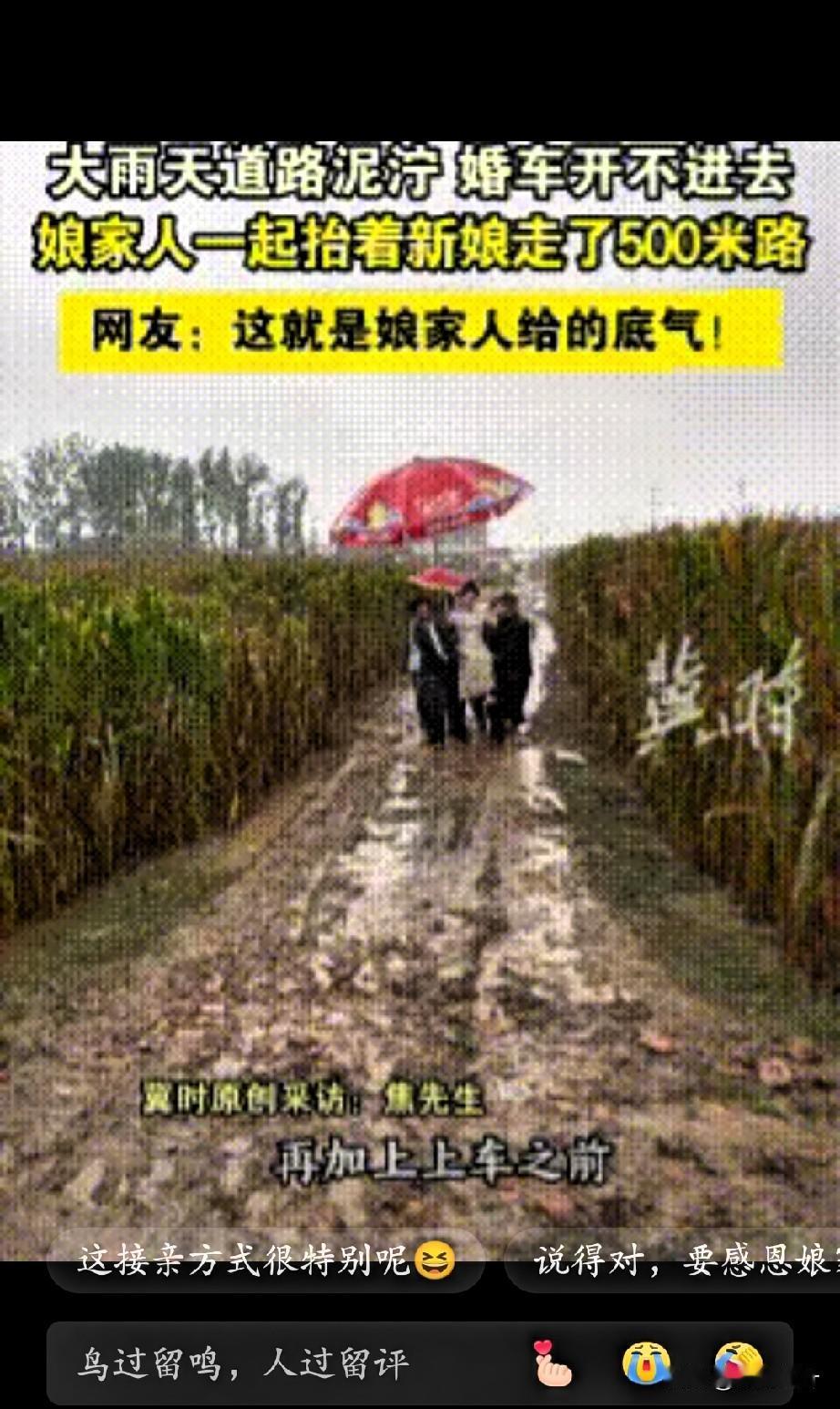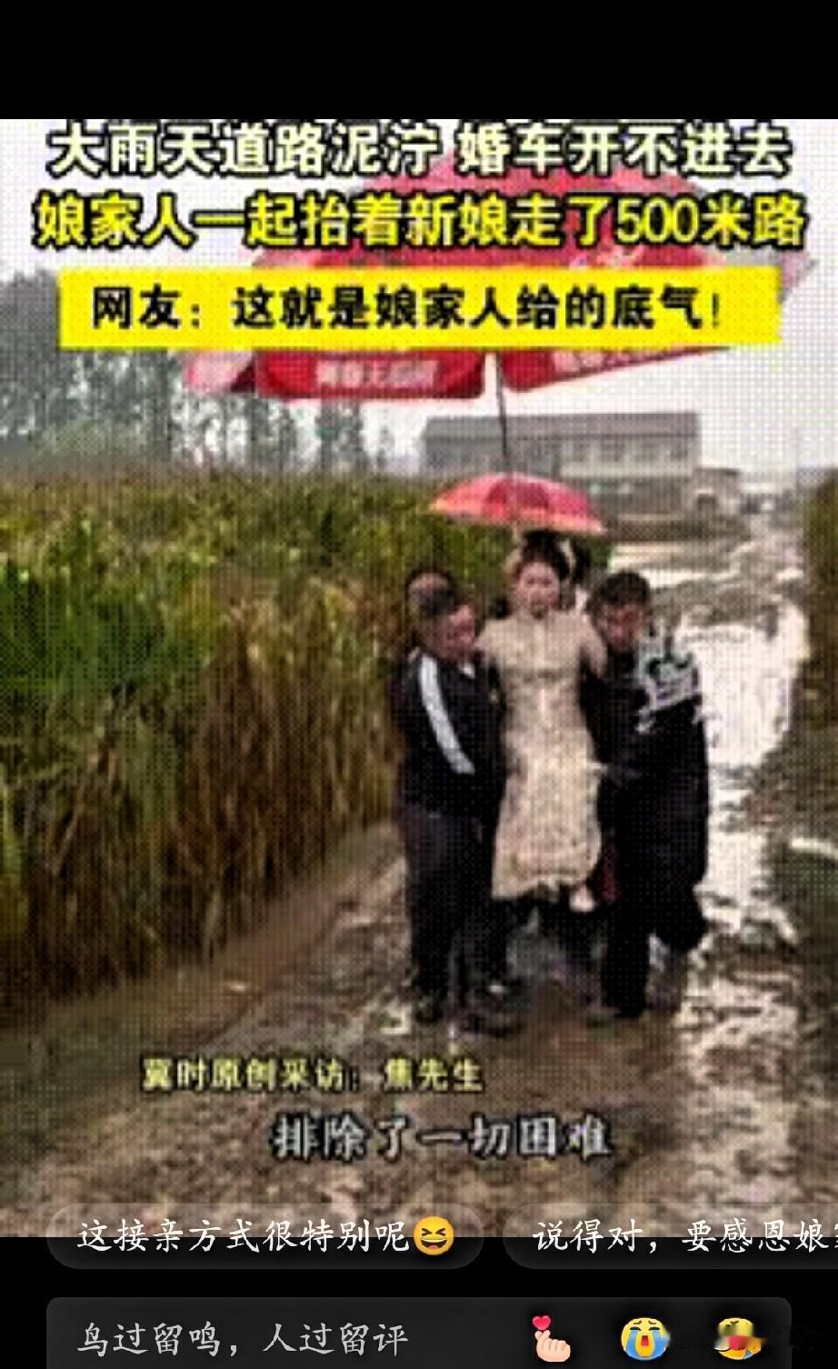 “娘家给的底气真足”!河南商丘姑娘出嫁这天,老天爷偏泼下一场大雨,好好的接亲路全成了泥坑——婚车压根开不到门口,停在苞米地对面,离新娘家足足500米远。 更棘手的是,当地婚俗讲究“新娘脚不能沾地,去回不走同一条路”,这难题摆在眼前,谁看了都犯愁。 可新娘的娘家人,连犹豫都没有。几个叔伯搓搓手先开口:“啥也别说了,咱抬着过去!”兄弟辈立马找来了结实的座椅,长辈们小心扶着新娘坐好,一群人围着座椅,深一脚浅一脚往婚车挪。 雨水打湿了衣服,泥点子溅满了裤腿,没人喊累,反倒一路跟新娘打趣:“咱这婚结得特别,以后想忘都忘不了!” 路过的人举着手机拍,看的人都红了眼——这哪是简单的抬新娘?是娘家用最笨也最实在的办法,告诉女儿“别怕,有我们在”。现在总有人比彩礼多少、婚车档次,可商丘这家人却让大家看清:娘家的底气从不是钱堆的,是你遇事时,他们毫不犹豫站在你身前的样子。 你结婚时,娘家人有没有做过让你记一辈子的事?