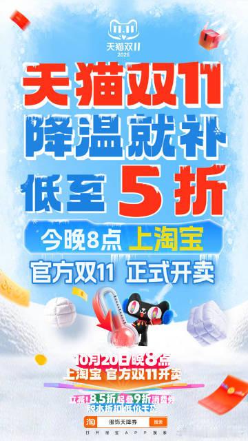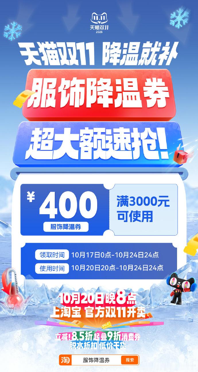 今晚8点天猫双11降温爆款5折起 双十一降温上淘宝,降温从不是时尚的对手,叠穿配色失灵,不存在的……天猫双11精选设计师款羽绒服、潮流卫衣,保暖与颜值统统在线~上淘宝🔍“服饰降温券”,今晚8点现货开抢,立减8.5折起还能叠券!要温度更要风度,轻松拿捏秋冬时髦感!今晚8点天猫4折买羽绒服天猫双11降温就补低至5折天猫双11才是真优惠