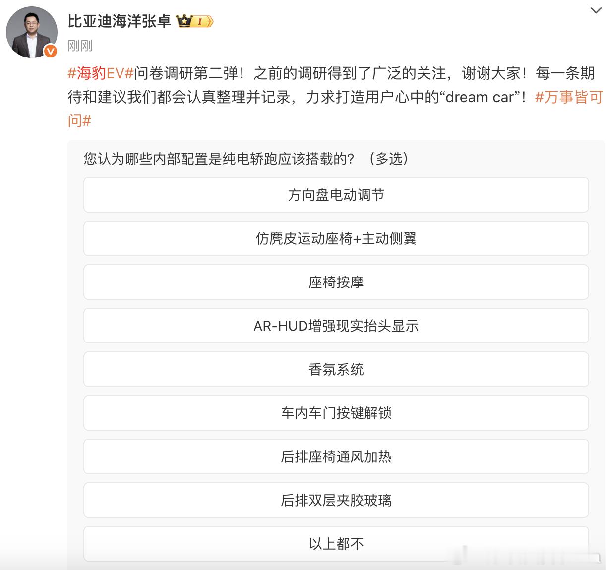 今天,张卓有发起了关于海豹EV内饰配置的调研,其中包括方向盘调节、仿麂皮运动座椅+主动侧翼、座椅按摩、AR-HUD增强现实抬头显示、香氛系统、车内车门按键解锁、后排座椅通风加热、后排双层夹胶玻璃等。