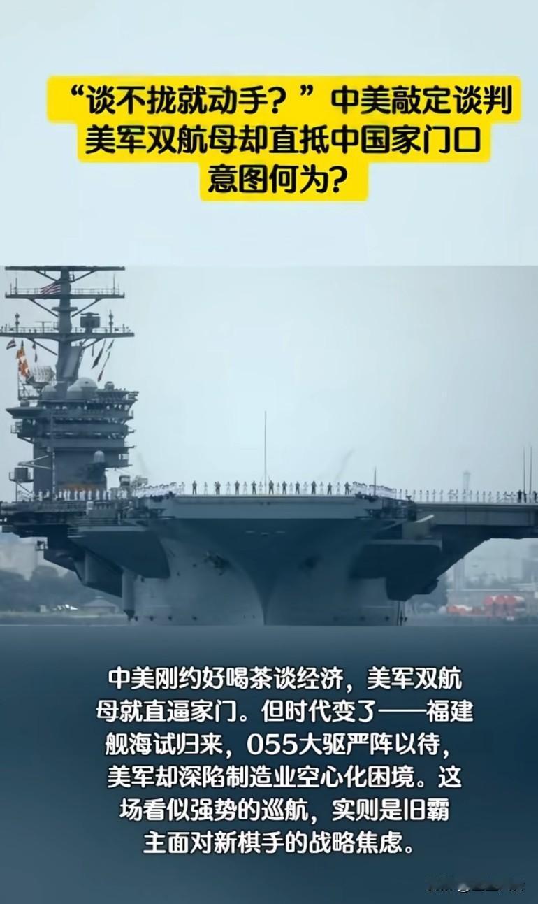 “谈不拢就动手?”中美敲定谈判,美军双航母却直抵中国家门口,意图何为? 出动两个航母战斗群就是开打的架势,谈判前先较量一波,谁占优势谈判桌上才更硬气,把激光武器摆出来试试…辽宁舰,山东舰,福建舰,也去他们家门口转转去啊。一个大国的崛起,不可能和平崛起,自古以来都是打胜了,才能崛起,汉,唐都是如此,