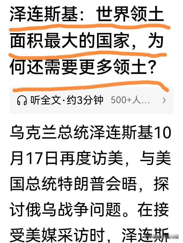 【质问】泽连斯基的这句话,也是许多国家想问的!世界领土第一大国,为什么还要,再要。甚至不惜发动大的战争伤亡数百万人! 特朗普,听到这些话,好像并没有听进去,据消息报道,还要求泽连斯基哥让顿涅斯克! 大家怎么看?