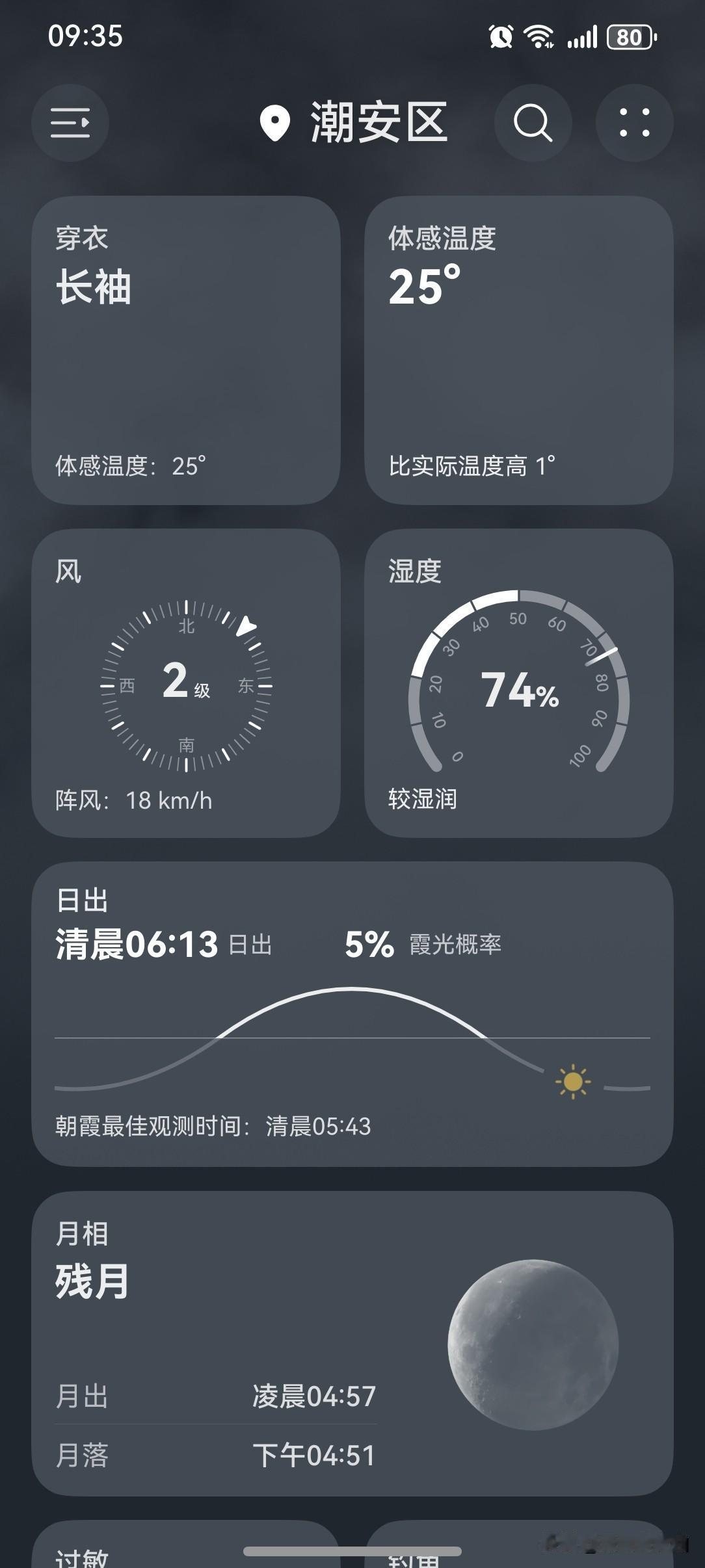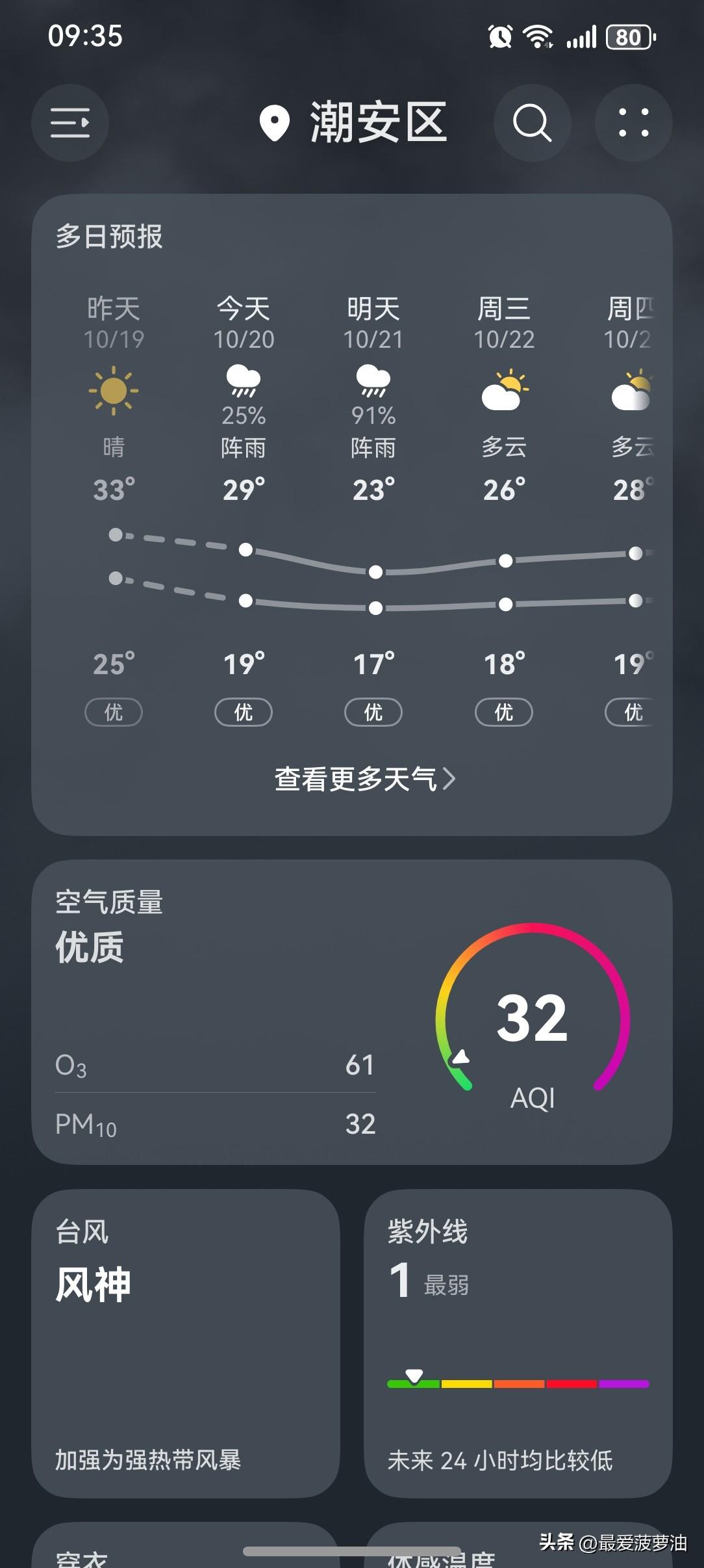 多地因强冷空气来袭大幅降温, 今晨北京跌破冰点, 河南下雪了, 气温骤降你添衣了吗? 台风风神助力冷空气广东大风继续吹, 广东北风添凉意! 受台风"风神"和冷空气共同影响, 21~22日, 我省海陆风力较大, 大部分市县气温继续下降3~5℃, 最低气温将出现在22日或23日早晨。 今天(20日), 潮州阵雨转阴天, 气温19~29℃, 此刻气温24℃。 今天一整天都是阴天, 偶尔下点小雨, 气温也是十分凉爽舒适。 太喜欢这张秋季清凉体验卡了! 这波体验感必须给个五星好评!