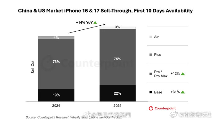 【“加量不加价”,#iPhone17被中国果粉买爆# :#苹果17在华销量超苹果16近1倍#】#iPhoneAir减产# 据财联社,研究公司Counterpoint周一在一份报告中指出,苹果新款智能手机iPhone 17系列在中国和美国两大市场的早期销售强劲,表现优于iPhone 16系列。报告指出,iPhone 17在中美上市后的10天内,销量比iPhone 16系列高出14%。其中,iPhone 17标准版在中国的销量与iPhone 16相比几乎翻了一番,两个市场的销量平均增长了31%。该公司高级分析师Mengmeng Zhang在报告中指出,iPhone 17标准版对消费者来说非常有吸引力,该机型拥有更好的芯片、改进的显示屏、更高的基本存储空间以及升级后的自拍相机,但价格却与去年的iPhone 16相同。不过,日本瑞穗证券上周的一份报告显示,由于市场表现未达预期,苹果决定减少100万台超薄机型iPhone Air的产量,并增加其他机型的生产规模。(每日经济新闻)