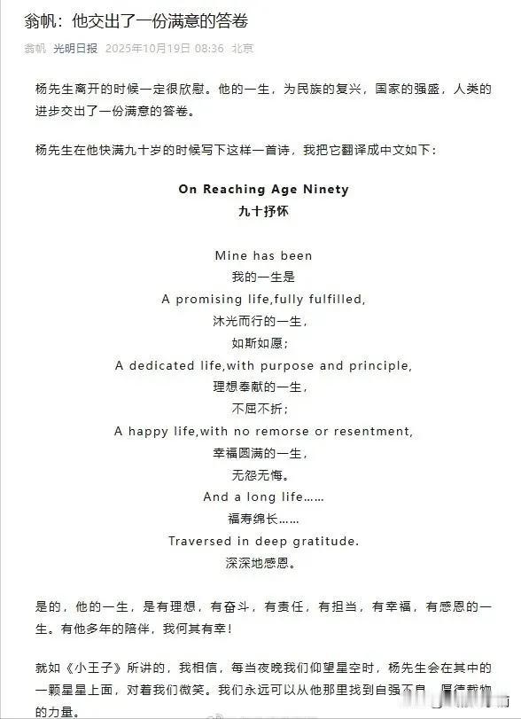 杨振宁icon103岁与世长辞,除了他透露的3个长寿原因,我发现还有另外一个 世界著名物理学家杨振宁先生近日以103岁高龄安详离世,这位科学巨匠留下的不仅是开创性的学术成就,更引发大众对长寿密码的热议。记者梳理老先生生前访谈发现,他亲自揭秘的三大长寿因素里,竟藏着一个被忽视的关键细节! "我肯定是基因彩票中奖者。"杨老在百岁访谈中摸着布满老人斑的脸笑道。杨家三代男性都因糖尿病并发症早逝,而他继承了母亲强大的抗病基因,这让他躲过了家族"糖魔咒"。但令人意外的是,当镜头扫过堆满英文期刊的书房时,老先生正哼着小曲给绿植浇水——这种刻进骨子里的乐观,或许才是真正的"长寿维生素"。 菜市场张阿姨刷到这则新闻直拍大腿:"怪不得我二舅天天吃保健品还是病歪歪,人家杨教授饿着肚子搞科研时都乐呵呵的!"确实,杨老提到在西南联大八年没吃过饱饭,却觉得"能活着研究物理就是幸福"。这种把困境当磨刀石的心态,比什么补品都管用。他现在每天雷打不动走一万步,见到邻居就聊量子力学,活得比小区健身器材还硬朗。 网友们炸开了锅:有人说老头子是靠顶级医疗资源续命,立刻被科普"他在普林斯顿骑自行车买菜"的旧闻打脸;还有年轻宝妈发现盲点——杨老58岁娶小54岁妻子,这"黄昏恋"怕是比深海鱼油更养人。不过最戳中打工人的,是他90岁写的打油诗:"晨起观云霞,夜归数星斗,此生无憾事,豆腐配老酒。"这哪是科学家,分明是当代陶渊明! 看着杨老与妻子翁帆搀扶散步的照片,保健品销售员小王若有所思:"我爸天天抱着'长生不老'贴吧钻研,不如带他去公园晒晒太阳。"科学圈则掀起新话题:顶尖大脑的活跃度是否真能延缓衰老?毕竟杨老100岁还在给清华本科生改论文。 暮色中,小区广场舞喇叭突然响起《最炫民族风》,大妈们跳得正欢。这场景让人想起杨老那句话:"长寿不是数字游戏,是看你能笑着数完多少次日落。"所以啊,与其纠结家族有没有长寿基因,不如学老爷子——该走路时走路,该傻乐时傻乐。话说回来,要是人人都活到100岁,养老金还够发吗?作品声明:内容取材于网络。