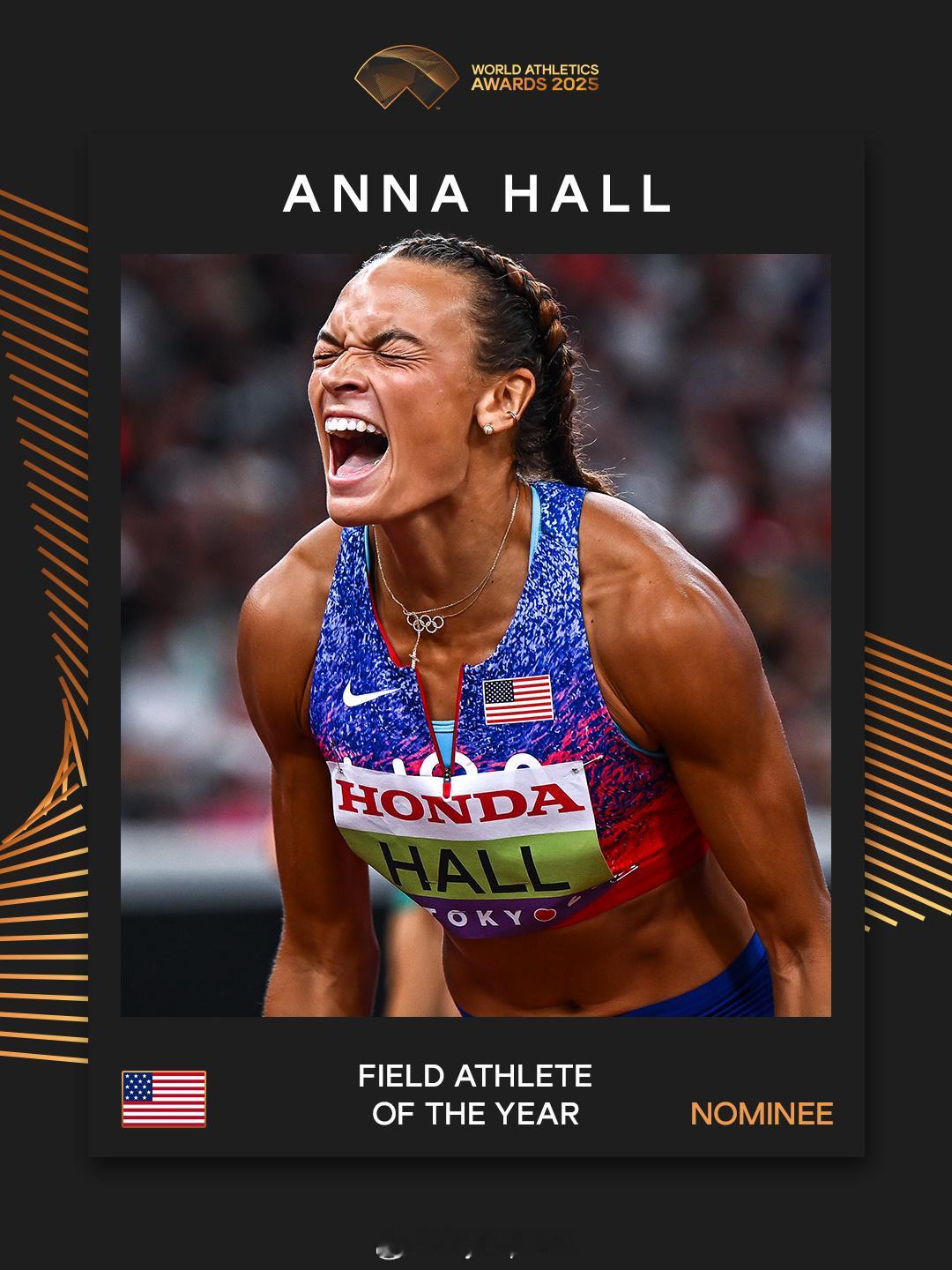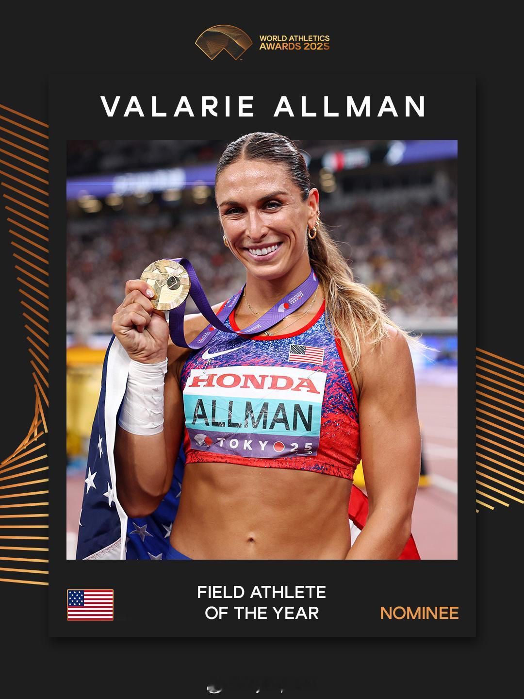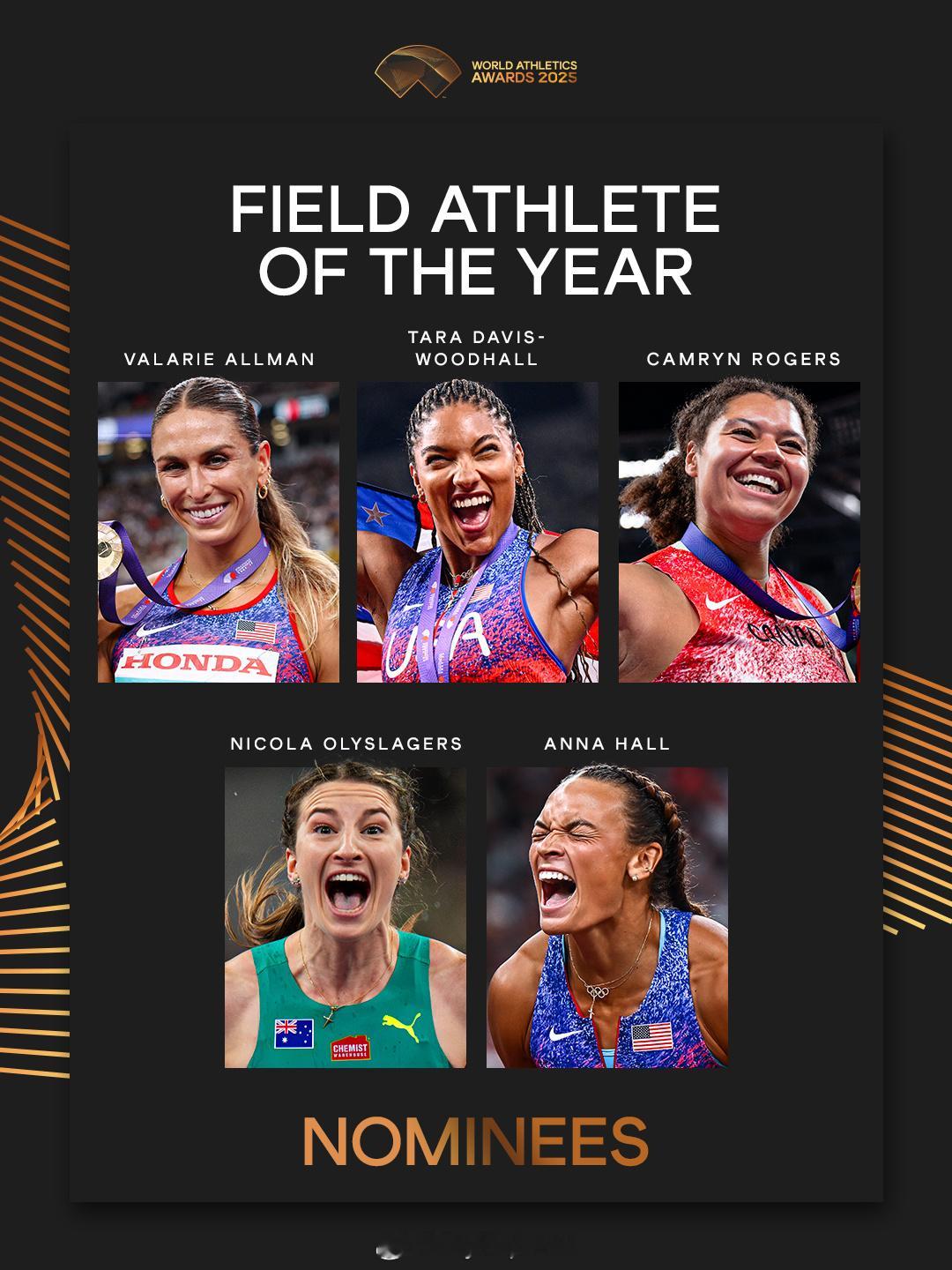 【2025世界田联最佳田赛运动员初选名单】国际体坛动态 10月20日,世界田联公布了2025年男子/女子田赛项目年度最佳运动员初选名单各5人,将从中选出各2人成为最终的候选者。名单如下: