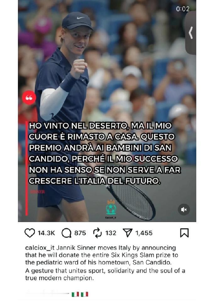 辛纳六王赛的奖金全部捐给了家乡的儿科病房!据说今年六王赛奖金可是高达600万美元啊!这应该是网球运动员中单笔数量最高的慈善捐款了吧? 网友不禁感慨道:此时此刻,怎么夸都显词穷与浮夸! 此前,网上还很多关于辛纳挑比赛打,动不动选择伤退的传言。现在这些传言应该随着这次的捐款烟消云散了吧?之前还那么多故意曲解他的人,叫他药家鑫,现在应该没人叫了吧?