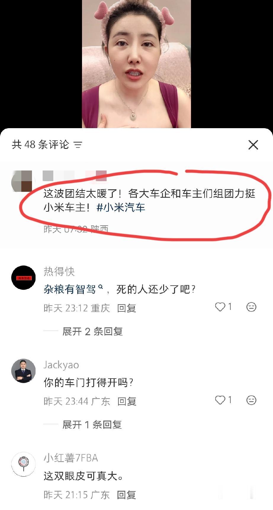 美女主播发视频称:各大车企和车主们组团力挺小米车主,这波团结太暖了! 这位美女主播在视频中表示:比亚迪、理想深蓝、东风日产这些品牌的车主纷纷出来力挺小米车主…… 看了一下这位美女主播的账号主页,她称自己是“36岁未婚未育,负债前行中”。我比较好奇的是,她这个负债的钱都花在什么地方了,难道说是划拉她脸上那对双眼皮了?