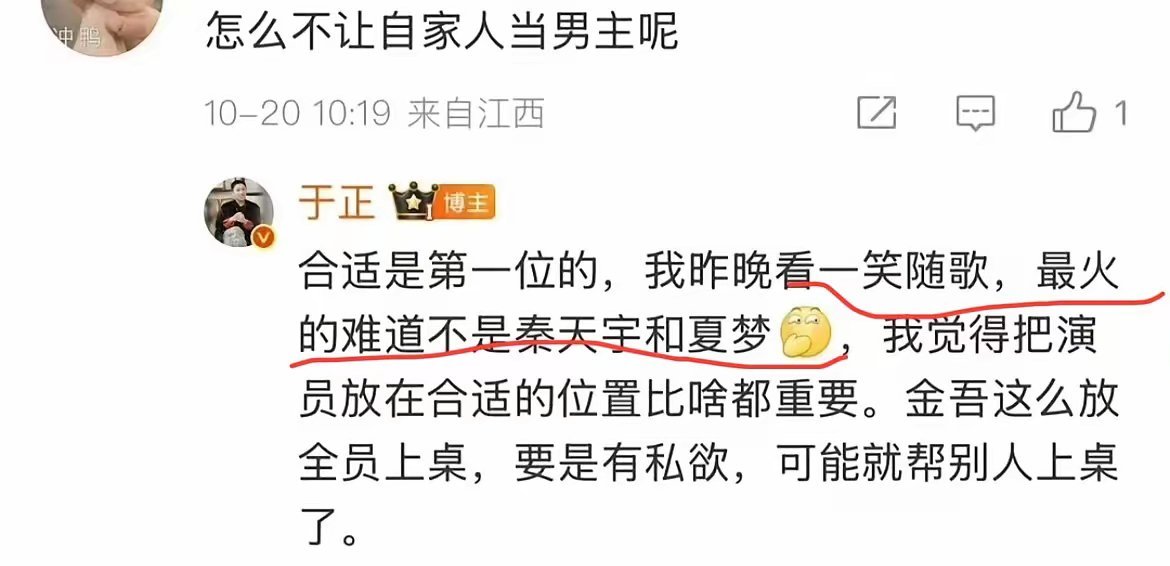 ​于正和网友对质,说最近热播的古装剧《一笑随歌》,最火的是秦天宇(男四号)和夏梦(女二号)。