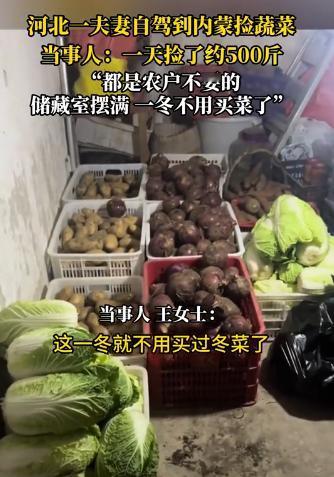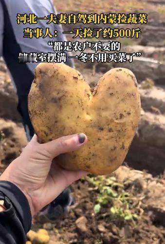 河北一对夫妻去内蒙古玩,发现路边地里有很多蔬菜、土豆,竟然直接跑地里捡,农户发现后,不但不阻拦,反而催促他们:快捡吧,随便捡!原来,这些蔬菜都是农户不要的,就算他们不来捡,也是放在地里烂掉,夫妻俩1整天,捡了500斤,整个冬天的蔬菜都有了!网友:这样挺好的,不浪费粮食!   十月的北方,秋风吹散了夏末的燥热,正是自驾出游的好时候。   河北的张先生和妻子早就计划着去内蒙古看草原秋色,收拾好行李、加满油箱,两人一路向北,盼着能见到“风吹草低见牛羊”的壮阔景象。   可谁也没料到,这趟以风景为目的的旅行,会在一片农田里收获最意外的温暖。    车子驶进内蒙古东部的乡村公路时,路两旁的景色从草原渐渐变成了规整的农田。   秋收刚过,地里的作物大多已经收割完毕,只剩零星的秸秆留在土里。   可张先生妻子偶然往窗外一瞥,却发现不远处的田里有些不一样。   一片片绿色散落在褐色的土地上,走近了才看清,是没被收走的白菜、土豆和洋葱。   她拉着张先生停下车,两人沿着田埂走过去,蹲下身仔细看。   白菜裹得紧实,外层菜叶还带着刚从土里拔出来的湿润泥土气,比市场上卖的小一圈,却透着新鲜。   土豆埋在浅浅的土层下,扒开土一看,表皮光滑得能映出田埂边的野草影子,没半点虫眼,这么好的菜,怎么没人收啊?   张先生妻子小声嘀咕,两人心里满是疑惑,既觉得可惜,又不敢贸然动手。   毕竟长在别人地里的菜,就算没人要,随便拿也不合适。   就在两人蹲在田埂边犹豫时,远处传来了拖拉机的突突声,一位穿着深蓝色劳动服、皮肤黝黑的农户大爷扛着锄头往这边走。   看到他们,远远就笑着喊,你们是来玩的吧?想捡菜就捡,这些没人要了,留着也是烂在地里!   听到这话,夫妻俩才放下心来,赶忙迎上去问清楚。   大爷擦了擦额头的汗,指着地里的蔬菜解释,这是晚熟的菜,前段时间用机器收过一批了,剩下的要么是个头小,要么是长得歪,收购商不要。   你说雇人来二次捡吧,人工费比这些菜卖的钱还多,不划算。   再说咱们这儿冬天来得快,过不了半个月土地就冻硬了,菜也存不住,与其烂在地里当肥料,不如让你们拿回去吃,不浪费。   说着,大爷还转身从自家田边的棚子里抱出两个大编织袋,塞到他们手里,那边的土豆土松,好挖,你们多捡点,冬天菜贵,能省不少钱。   有了大爷的许可,夫妻俩挽起袖子忙活起来。   张先生负责挖土豆,蹲在垄边,小心翼翼地扒开土层,把大小合适的土豆一个个捡出来,生怕碰坏了。   妻子则负责挑白菜和洋葱,把外层有点蔫的叶子摘下来,只留里面新鲜紧实的部分,再分类装进袋子里。   从上午太阳刚升到半空,到傍晚夕阳把田野染成金黄色,两人几乎没歇过脚,田埂边的袋子越装越满,最后称重时才发现,足足有500斤。   后备箱塞得严严实实,后座也腾出一半空间堆菜,车子开在路上,两人看着满车的收获,心里比看到草原风景还高兴。    回到河北老家后,夫妻俩第一件事就是整理这些“战利品”。   看着储藏室里堆得像小山一样的蔬菜,张先生妻子忍不住跟邻居感慨,这500斤菜够我们吃一冬天,省的菜钱比来回的油钱还多。   更重要的是,内蒙古大爷的热情,让我心里一直暖烘烘的。   这件事被夫妻俩分享到网上后,很快引来不少网友热议。   其实,像这样“共享尾货蔬菜”的情况,在全国不少农村都能见到。   这些农户不是“不差钱”,而是知道“浪费更可惜”。   数据显示,我国每年农产品损耗率约15%,其中蔬菜因保鲜期短、运输难,损耗率能达到20%以上。   而这些“尾货蔬菜”的再利用,正是减少损耗的一种朴素智慧。    张先生夫妻俩当初奔着草原风景去,却意外收获了比风景更珍贵的东西。   那500斤蔬菜,装的不只是一冬天的食材,更是农户对粮食的敬畏,对陌生人的善意。   在追求“完美商品”的当下,那些因个头小、长得歪而被“剩下”的蔬菜,反而成了连接城乡、温暖人心的纽带。