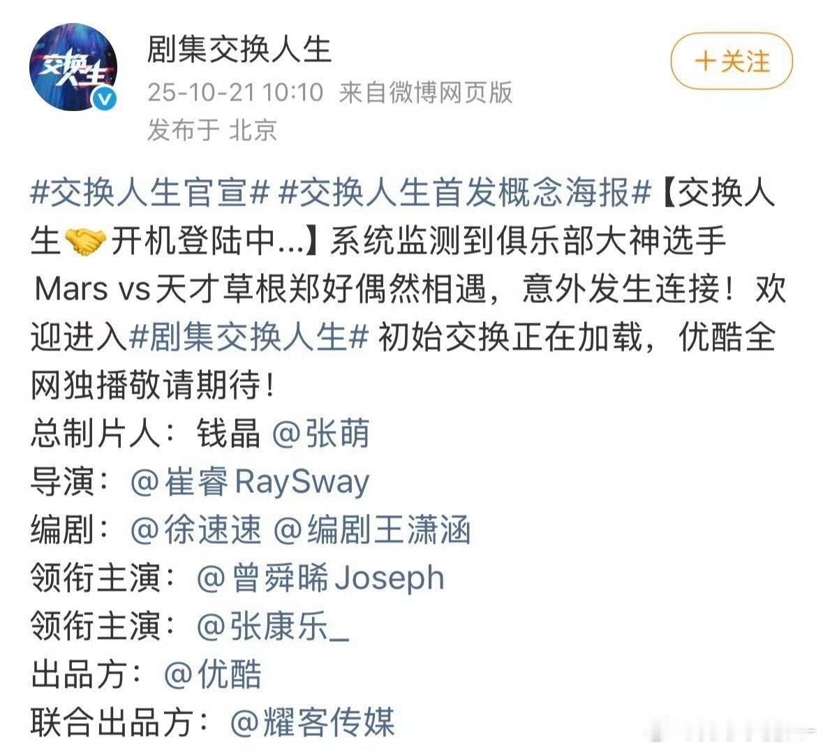 《交换人生》官宣,领衔主演:曾舜晞、张康乐 ​​​