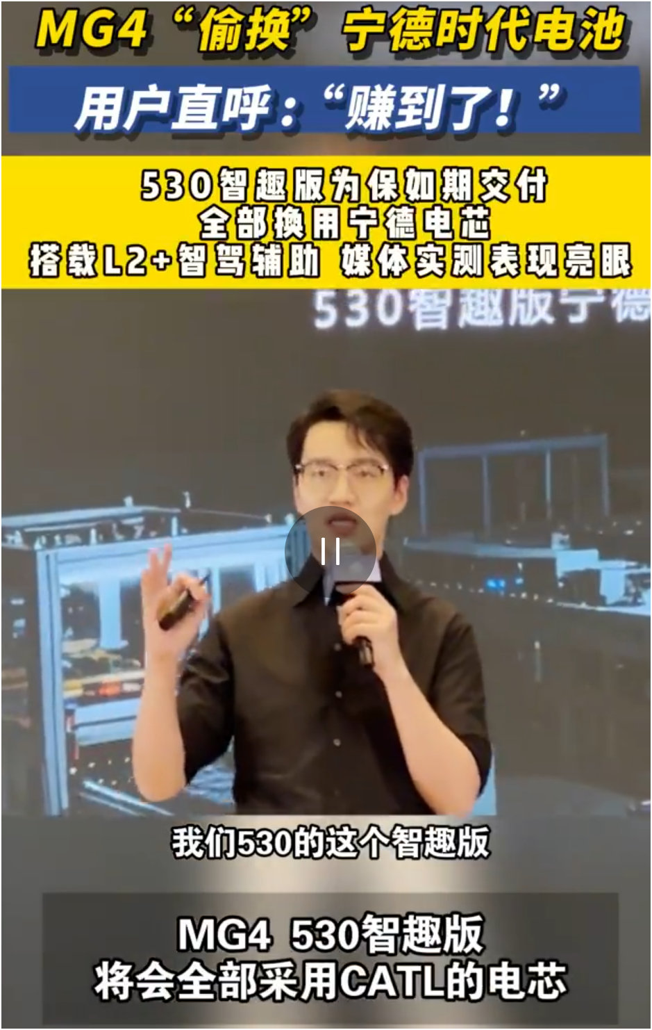 MG4偷换宁德时代电池MG4 530智趣版悄悄换上宁德时代电池,被眼尖的媒体发现后,MG总经理陈萃直接摊牌了,就是为了赶交付,自家电池产能跟不上,就先找宁王顶上,这波属于是反向减配了!