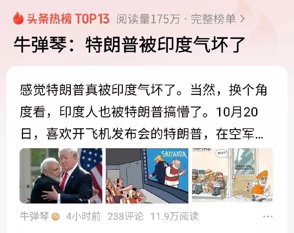 [印度不配合川普演出,把川普气坏了。] 早先,川普曾说印巴停火协议是他出面调停的。 结果印度发言人说,没这事,停火协议是印巴双方协商的。 印度媒体说,川普是自作多情,太把自己当回事了,往自己身上揽功。 莫老仙说,这事和川普没一毛钱的关系。 川普本来想混个和平奖什么的,结果印度不鸟他,把他气得够呛。 这事没过去多久,这一次印度人又耍川普。或者说川普自欺欺人吧。 川普前几天对外宣布,说印度已答应不购买俄国油气了。 但印度发言人又说,没这事! 这让川普很尴尬。这小阿三就是个刺头啊。 看川普如何收场。