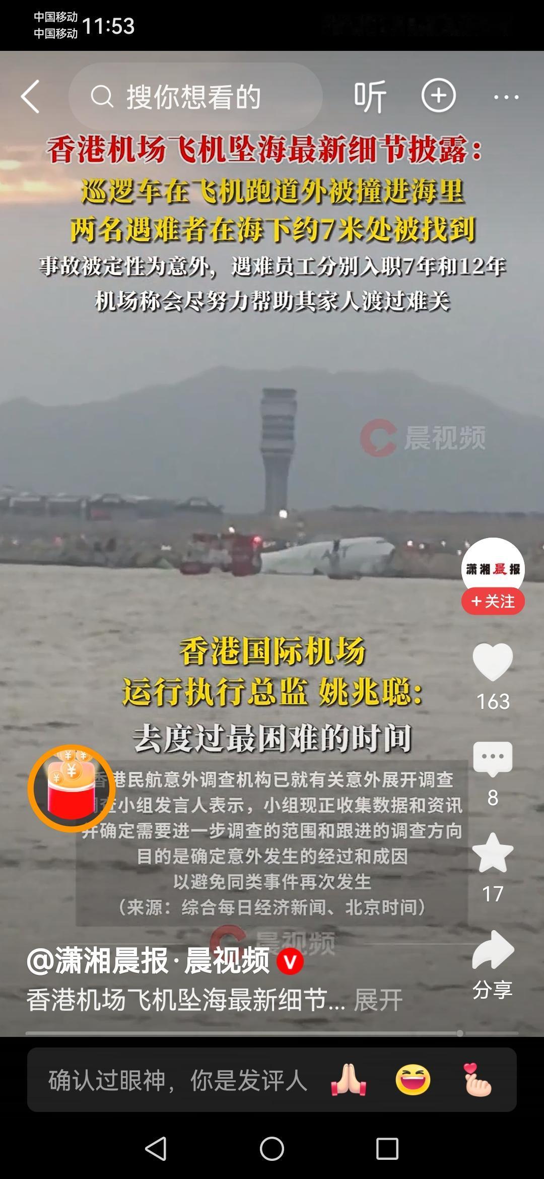 香港机场飞机坠海,两人殉职海底7米 香港国际机场一辆巡逻车在跑道外意外坠海,两名员工被困车内,最终在海下约7米处被寻获,均已不幸遇难。据悉,两人分别入职7年与12年,属资深员工。机场执行总监姚兆聪表示将全力协助家属,民航意外调查机构已启动调查,旨在厘清事故成因,防范悲剧重演。 每一次意外背后,都是一个家庭的破碎。安全生产,警钟长鸣! 你认为机场地面安全还有哪些环节需要加强?