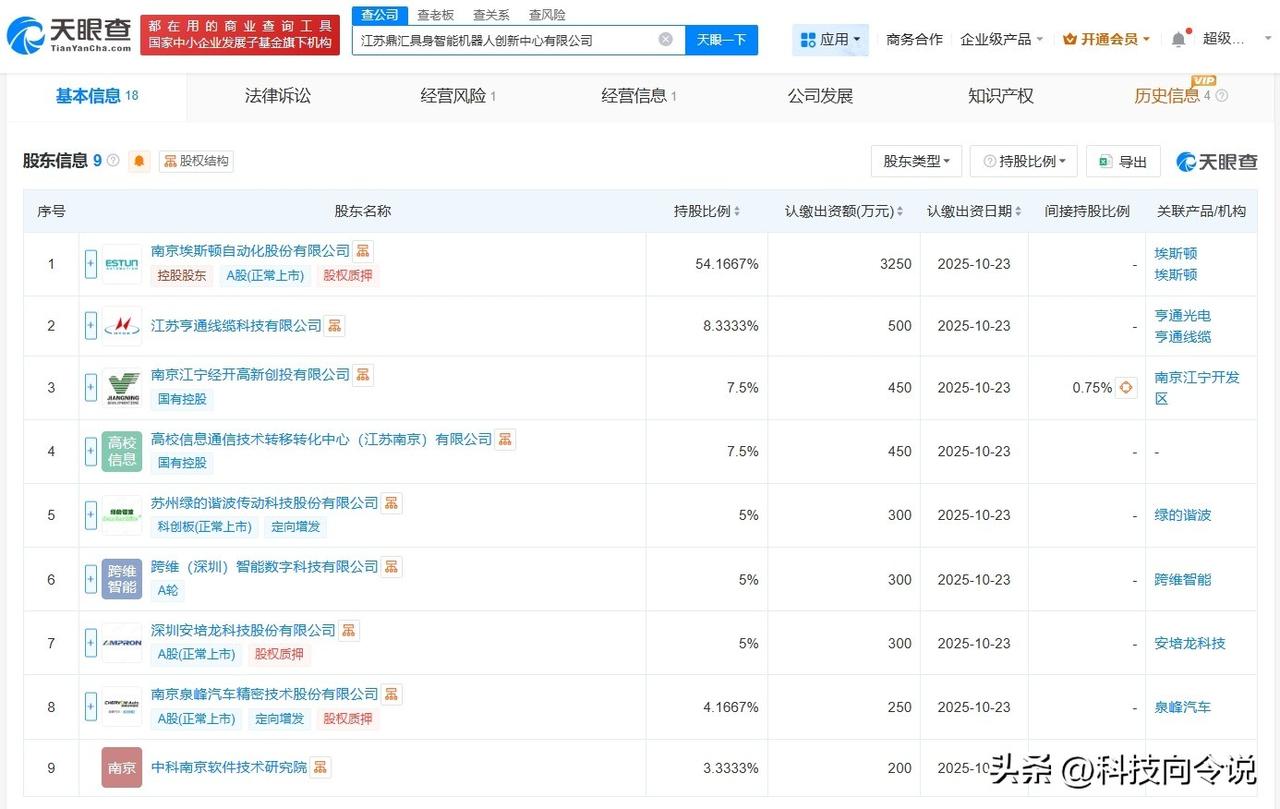 【埃斯顿等成立鼎汇具身智能机器人创新中心 注册资本6000万】 天眼查工商信息显示,近日,江苏鼎汇具身智能机器人创新中心有限公司成立,法定代表人为周爱林,注册资本6000万人民币,经营范围包括人工智能行业应用系统集成服务、人工智能硬件销售、人工智能公共数据平台、人工智能通用应用系统等。股东信息显示,该公司由埃斯顿(002747)、江苏亨通线缆科技有限公司、绿的谐波(688017)、安培龙(301413)、泉峰汽车(603982)等共同持股。 天眼查信息:
