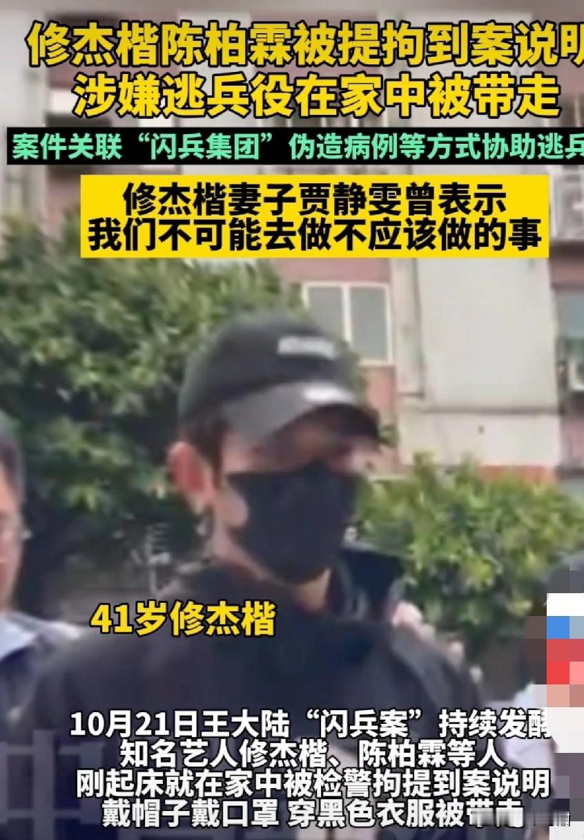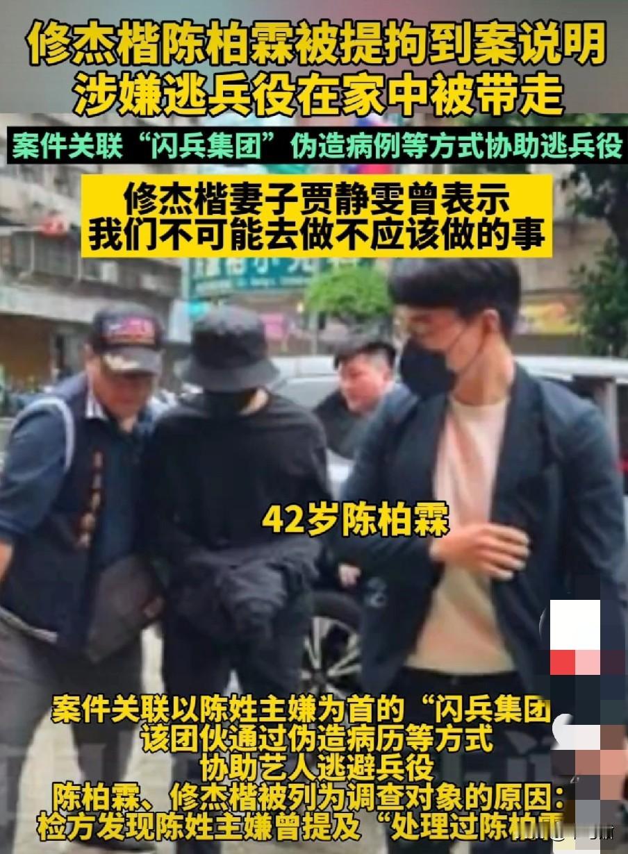 好突然,中国台省艺人修杰楷,陈柏霖双双在21日凌晨被带走,据悉,自王大陆事件被扩大了后,这是第三次整顿。 他们两个呢,一个被贾静雯生下三胎停止服从,另个直接装病逃过,可惜,还是被问责了。 据悉此次共计带走十个之前,没有服兵的,其中5个是艺人,这力度真是体现了台省的魄力啊,说带走就带走。 但是不知道带走以后会作何处理,毕竟目前这两人都年龄也并不适合当兵了。 (图片来自网络视频)