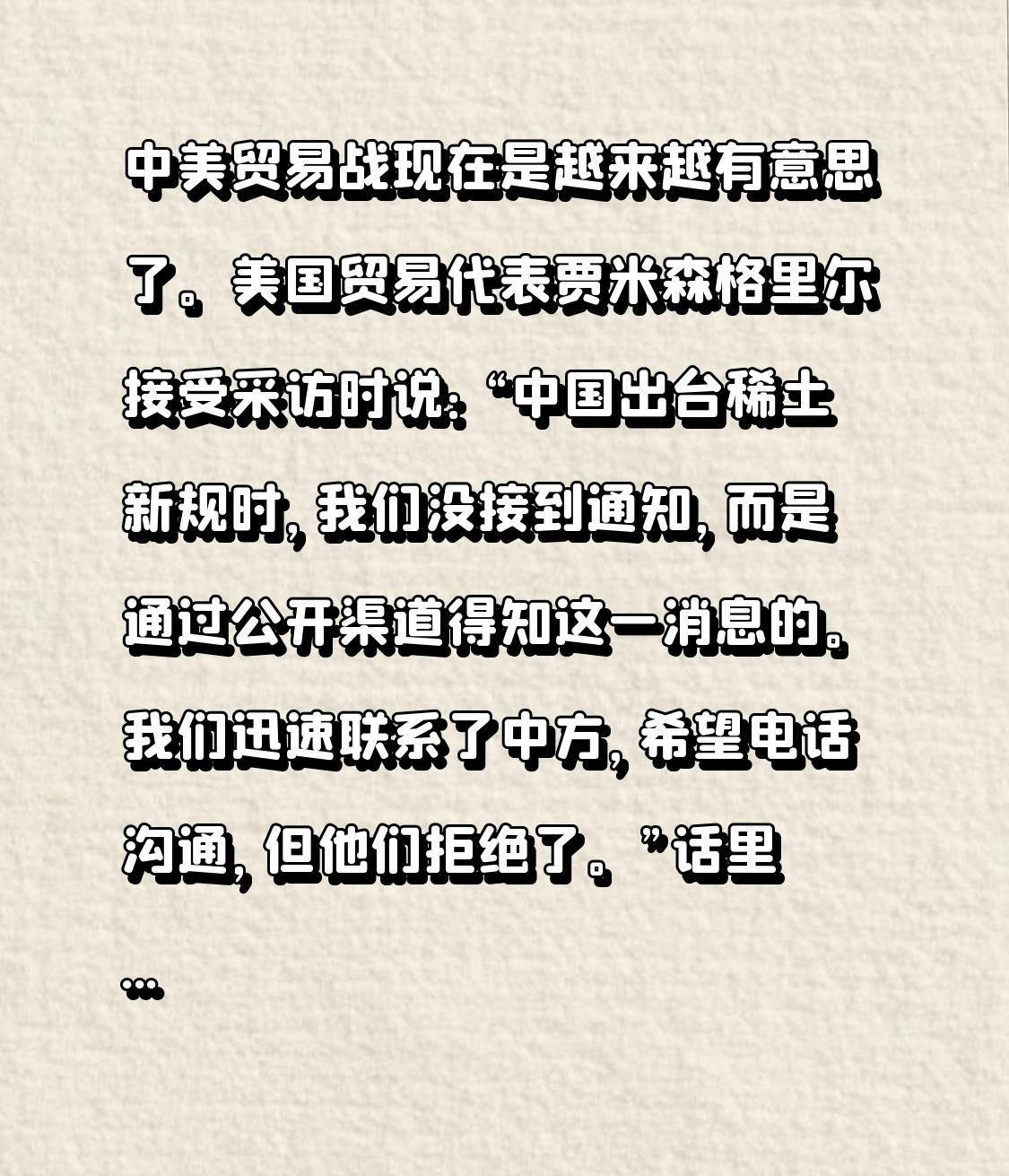 中美贸易战现在是越来越有意思了。美国贸易代表贾米森格里尔接受采访时说:“中国出台稀土新规时,我们没接到通知,而是通过公开渠道得知这一消息的。我们迅速联系了中方,希望电话沟通,但他们拒绝了。” 话里话外一股委屈味儿,难不成你们加关税搞制裁禁芯片时候先给我们打电话征求意见了?只能川普放火,不许兔子点灯? 哦,我倒是忘了,川普事先通知盟友和儿子了,让他们赶紧开空单,我马上要推特上加关税了,那帮人是赚得个盆满钵满。 中美稀土之争 中美贸易关系 中美经济贸易 中美贸易战略 美国对华贸易战 美国对华关税战 美对华贸易政策