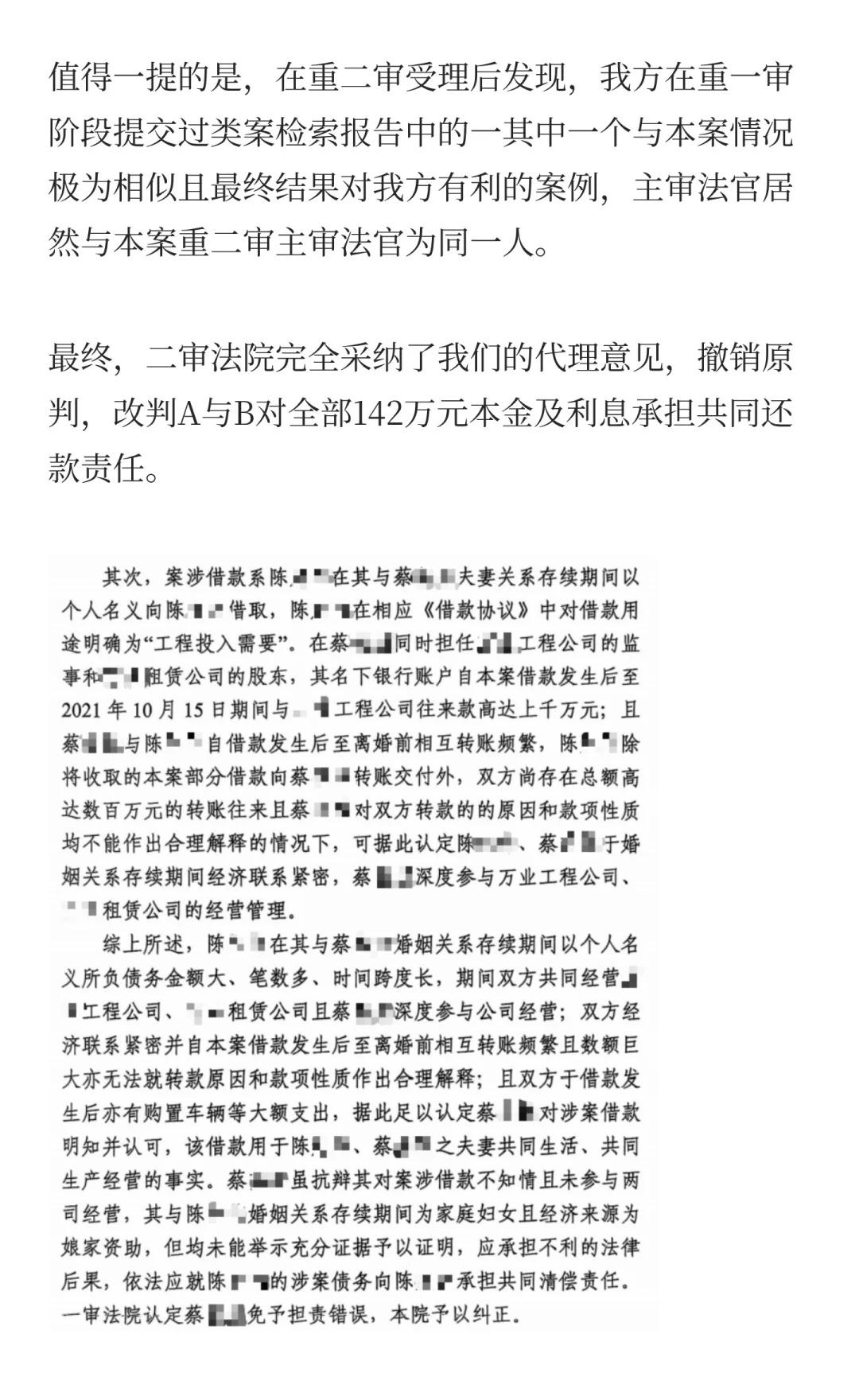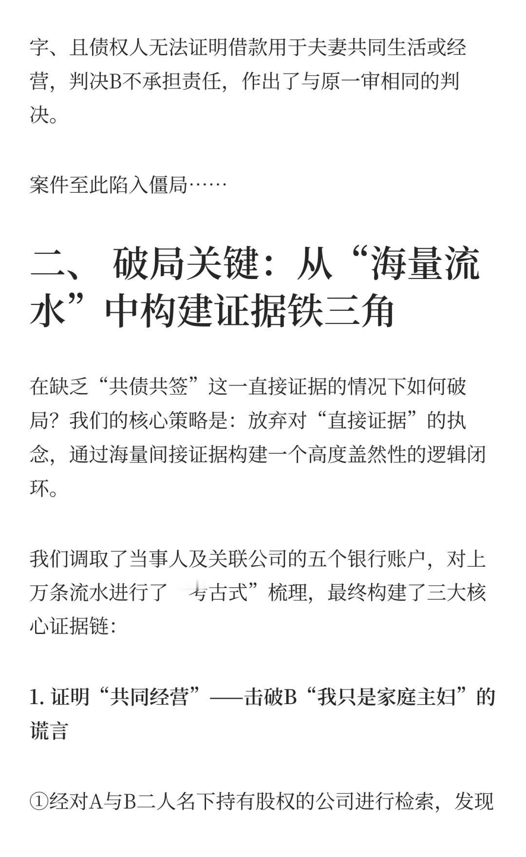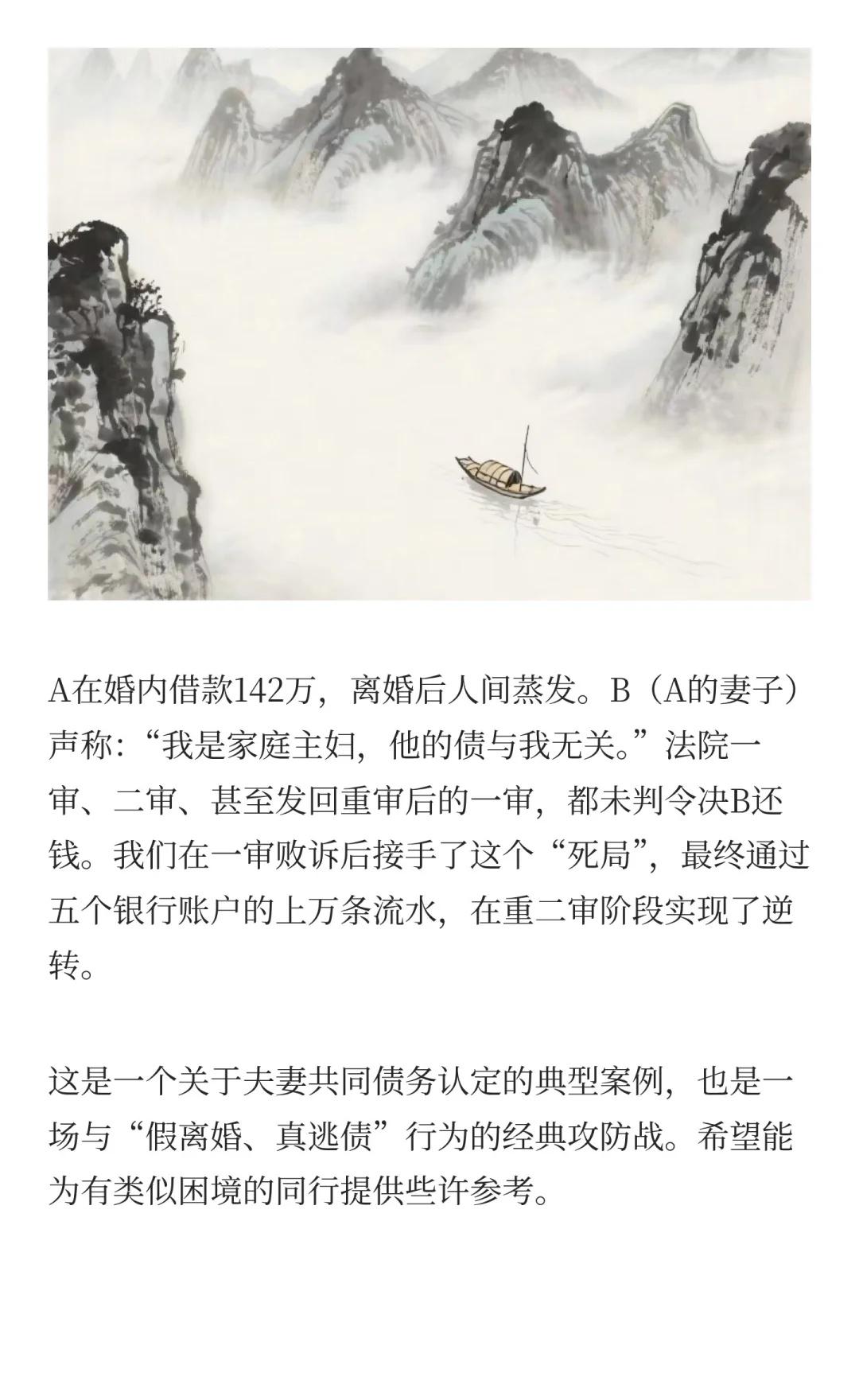 一场历经四审的“夫妻共同债务”攻坚战 A在婚内借款142万,离婚后人间蒸发。B(A的妻子)声称:“我是家庭主妇,他的债与我无关。”法院一审、二审、甚至发回重审后的一审,都未判令决B还钱。我们在一审败诉后接手了这个“死局”,最终通过五个银行账户的上万条流水,在重二审阶段实现了逆转。 这是一个关于夫妻共同债务认定的典型案例,也是一场与“假离婚、真逃债”行为的经典攻防战。希望能为有类似困境的同行提供些许参考。夫妻共有财产 夫妻共同债务人生中场而已 法律实务 律师