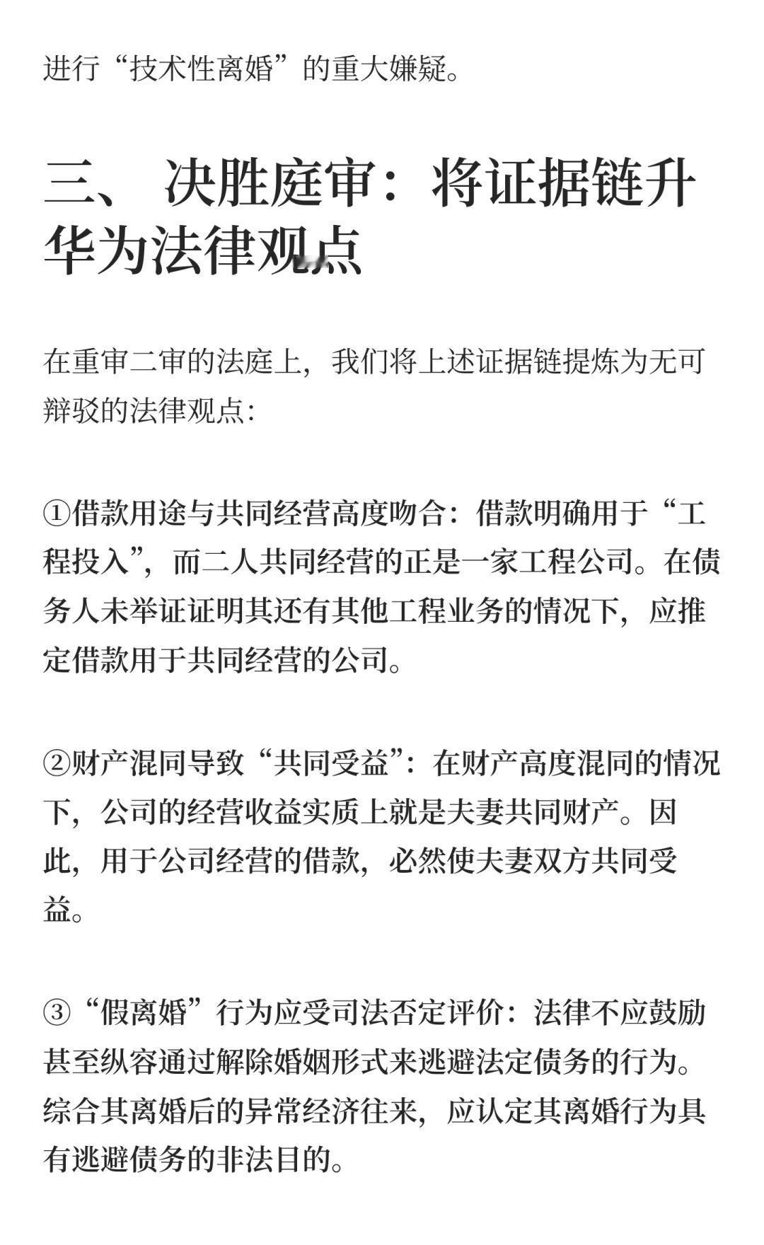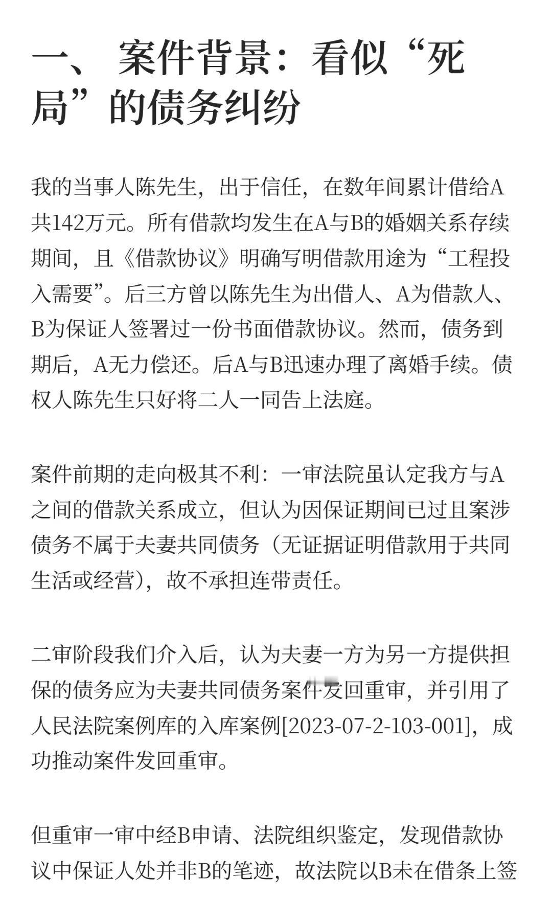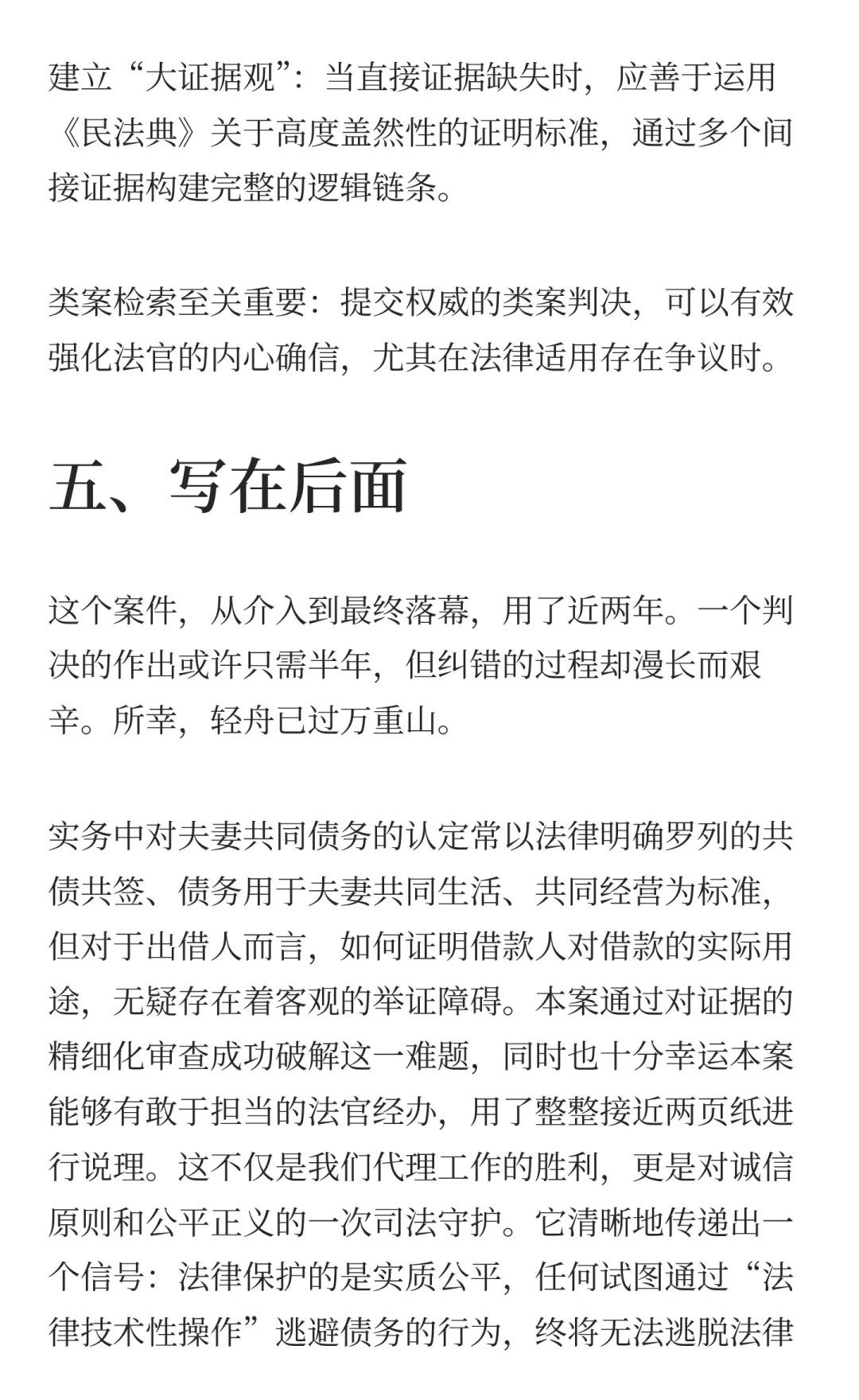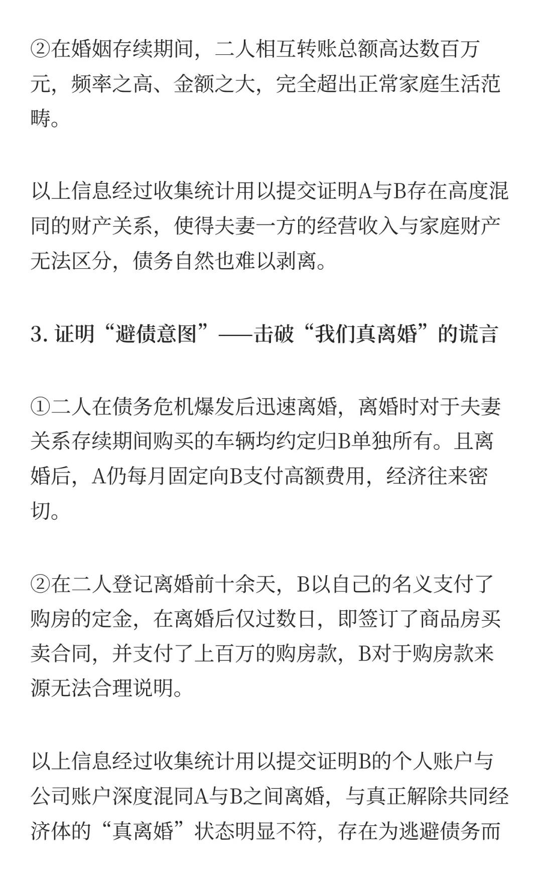 一场历经四审的“夫妻共同债务”攻坚战 A在婚内借款142万,离婚后人间蒸发。B(A的妻子)声称:“我是家庭主妇,他的债与我无关。”法院一审、二审、甚至发回重审后的一审,都未判令决B还钱。我们在一审败诉后接手了这个“死局”,最终通过五个银行账户的上万条流水,在重二审阶段实现了逆转。 这是一个关于夫妻共同债务认定的典型案例,也是一场与“假离婚、真逃债”行为的经典攻防战。希望能为有类似困境的同行提供些许参考。夫妻共有财产 夫妻共同债务人生中场而已 法律实务 律师