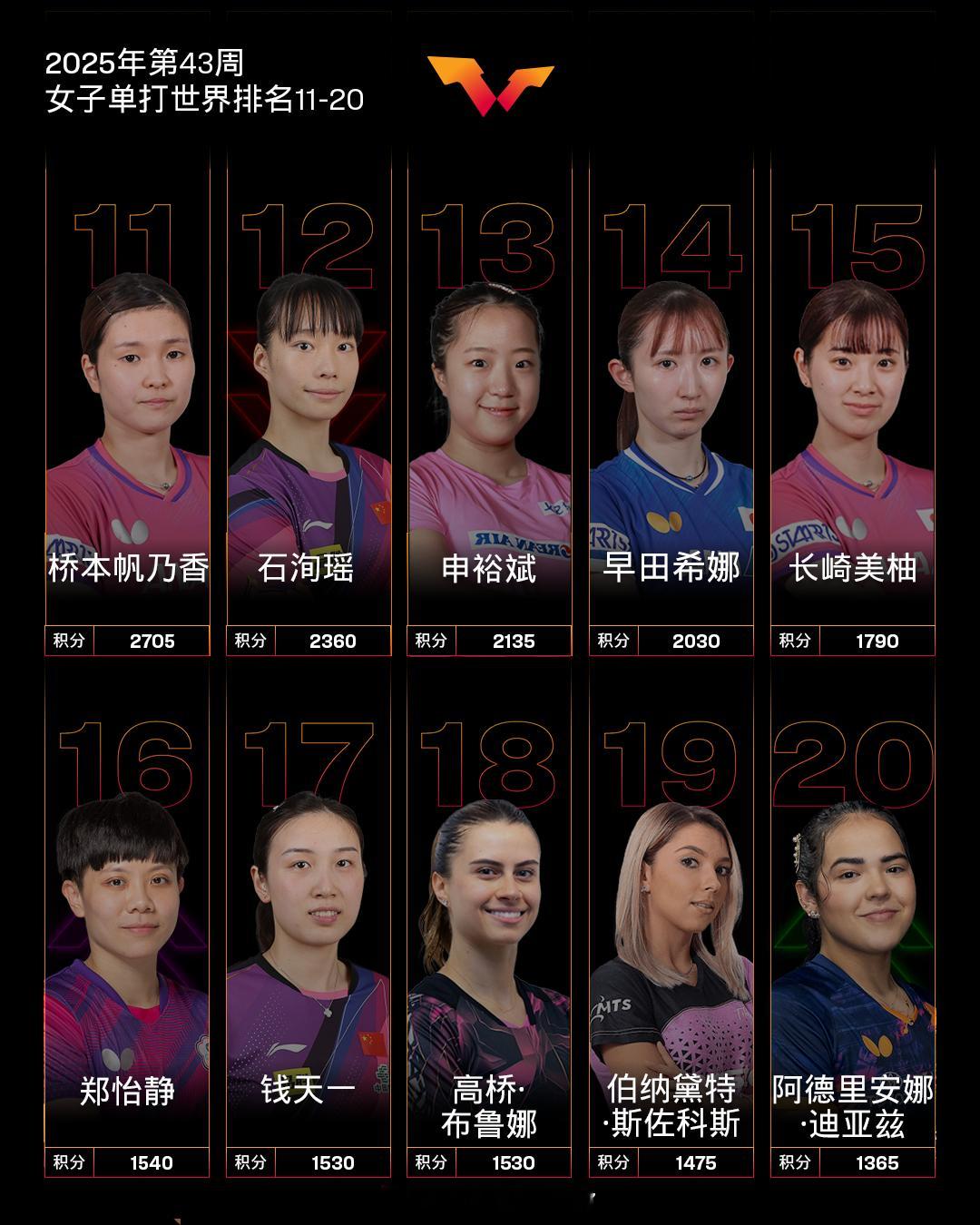 世界乒联公布2025年第43周排名,女单方面,中国队球员孙颖莎以11600分连续第171周霸榜第一,王曼昱、陈幸同、蒯曼、王艺迪位列前五,陈熠排名第8。