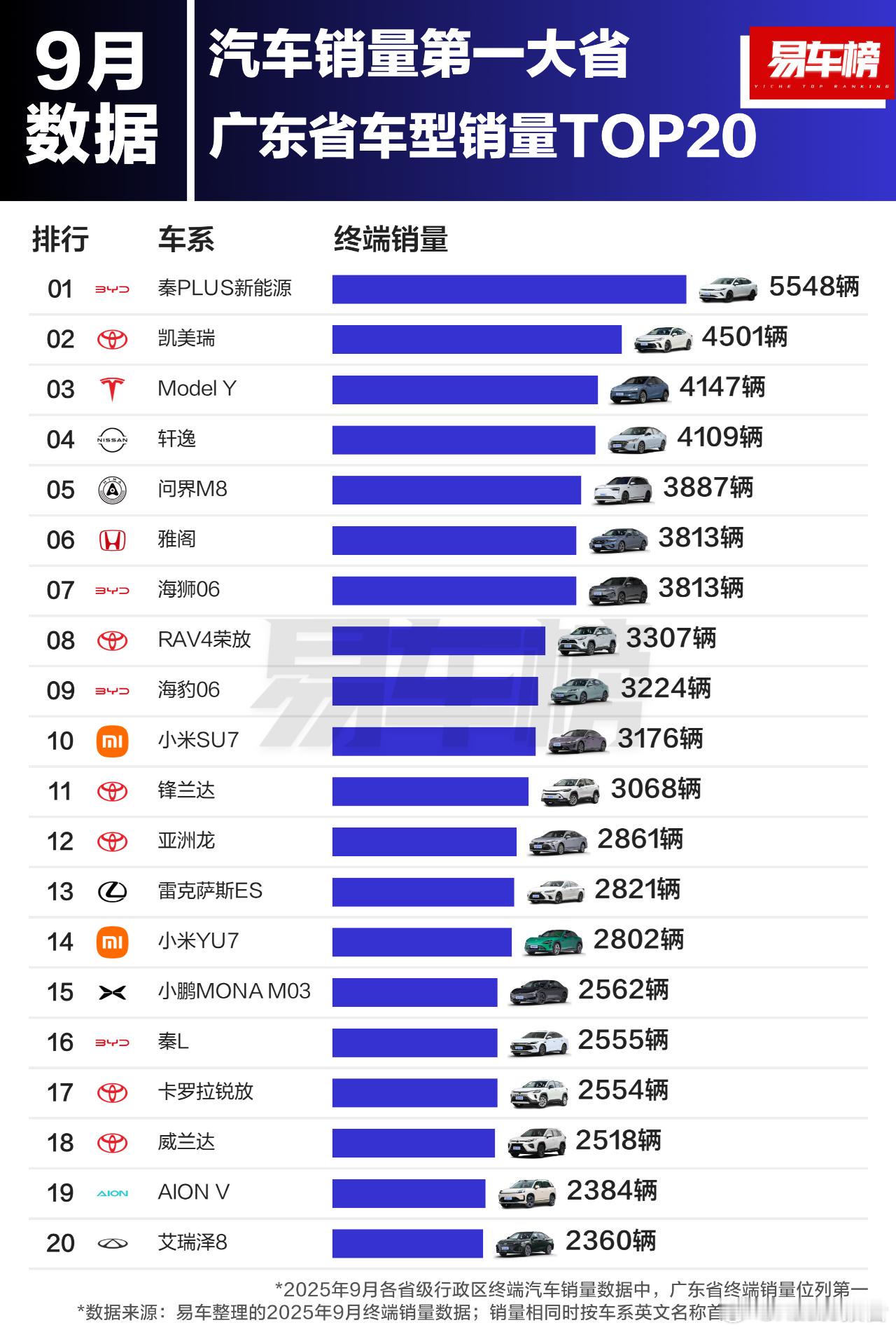 车型销量前3名分别为:秦PLUS新能源、凯美瑞、Model Y;终端销量分别为:5548辆、4501辆、4147辆。