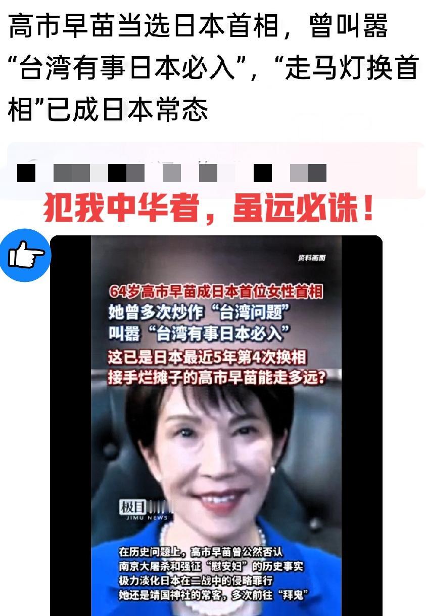 日本又换首相了!64岁的高市早苗刚上任,可这宝座看着就烫屁股,毕竟近5年换4任,人均任期才一年多,她能打破“短命魔咒”? 别光看换届热闹,这位新首相的路子才真该警惕。一边喊着“台湾有事日本必入”,一边给靖国神社送钱,连历史账都想赖,还非要把自卫队改成“国防军”,心思昭然若揭。 为了上台,她逼走合作26年的盟友,又给别的党派让利,执政根基早就不稳了。 更矛盾的是,她想搞对华“技术脱钩”,可日本企业一半利润都靠中国市场,真能硬刚到底?说白了,这种对内妥协、对外强硬的操作,更像给自己攒雷。 这届日本政府是会继续“作死”挑事,还是撑不过半年就换人?你们觉得高市早苗能撑多久?高士早苗