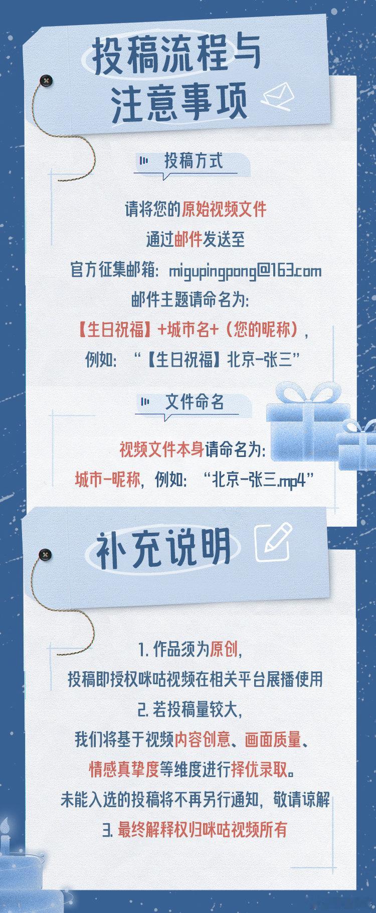 📮 投稿方式:将视频文件发送至邮箱migupingpong邮件主题格式:【生日祝福】城市-你的名字