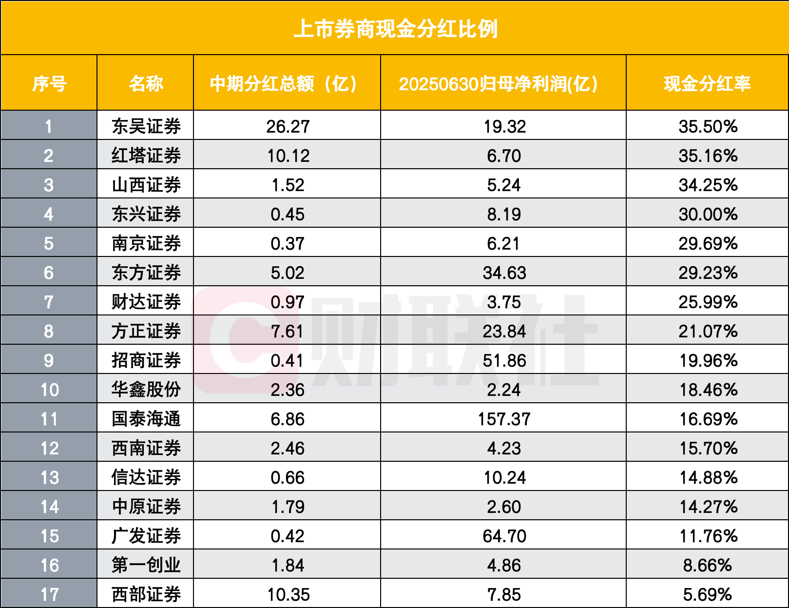 现金分红率角度来看,17家券商中,东吴证券以35.50%的分红率登顶,成为今年年中分红的“最大黑马”。其6.86亿元的中期分红总额,对应19.32亿元的中期归母净利润,每100元净利润中有35.5元用于回馈股东。