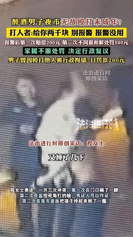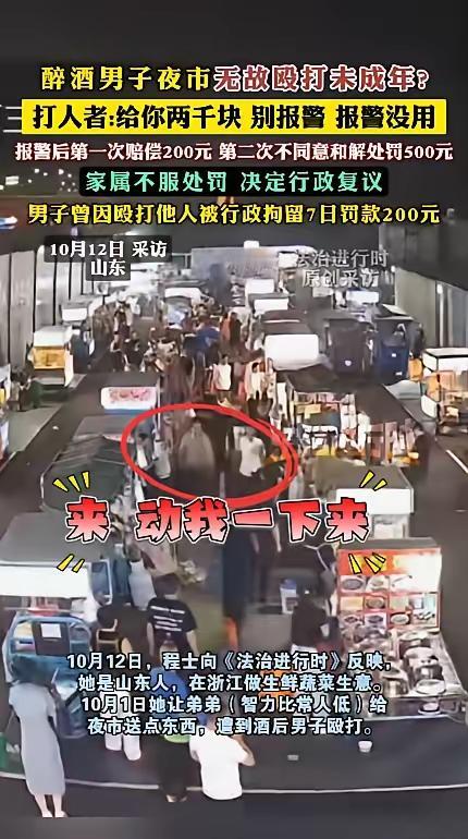 醉汉夜市围殴残障小伙,仅罚500元?姐姐硬刚:这事绝不能算完! 浙江某夜市最近这事,看了真让人血压飙升!山东程大姐带着智力停留在三岁的弟弟卖菜讨生活,那天让弟弟去送份菜,没成想撞上了个“酒蒙子”。 监控里看得明明白白,醉汉上来就无故踹了弟弟一脚,见弟弟懵在原地不会反抗,直接拽到角落拳打脚踢。有路人看不过去上前拉架,还被醉汉反手扇了好几巴掌,期间还嚣张放话“报警也没用”! 可没想到,警方最后只对醉汉罚款500元,连拘留都没有。程大姐看着弟弟身上的伤直掉泪,“我自己都舍不得碰他一下,凭啥让他这么欺负?”更气人的是,这醉汉之前就因打人被拘过7天,典型的“惯犯”! 要知道,法律明确规定殴打残疾人需处10日以上拘留,这500元罚款根本不合规。现在程大姐坚决申请行政复议,网友也全在挺她。大家觉得,这事儿该怎么处理才能让人心服?是该加重处罚,还是得追加赔偿?