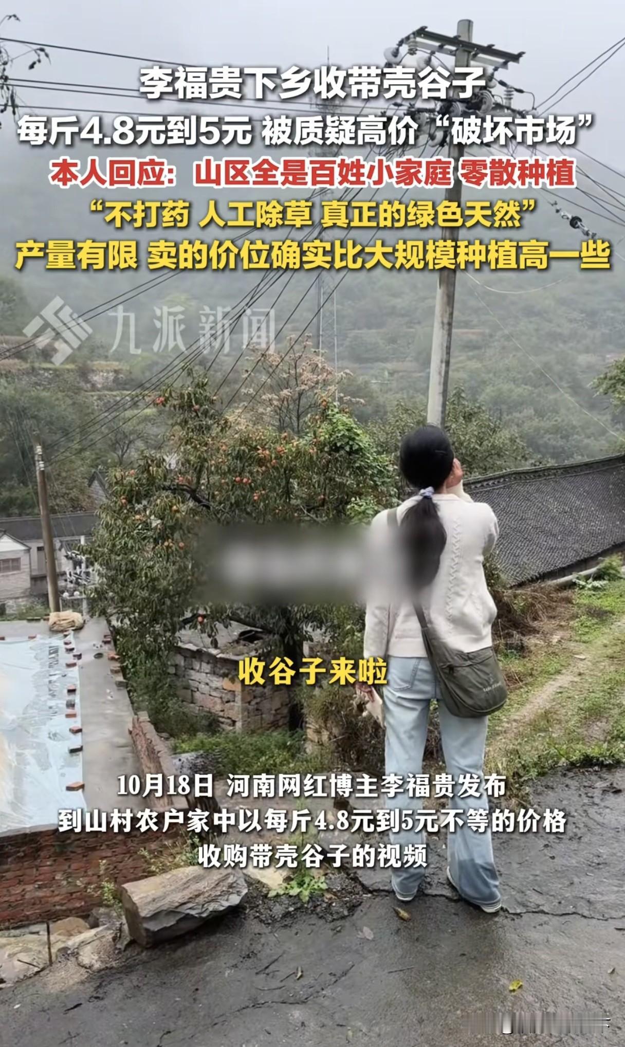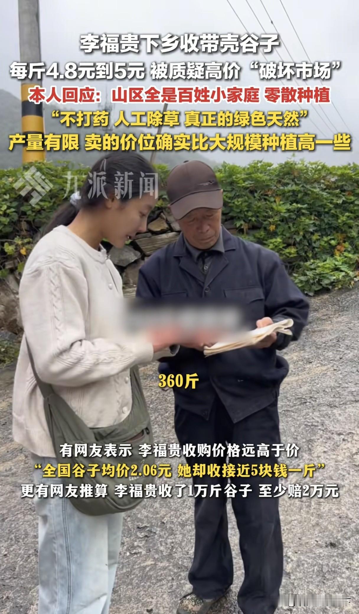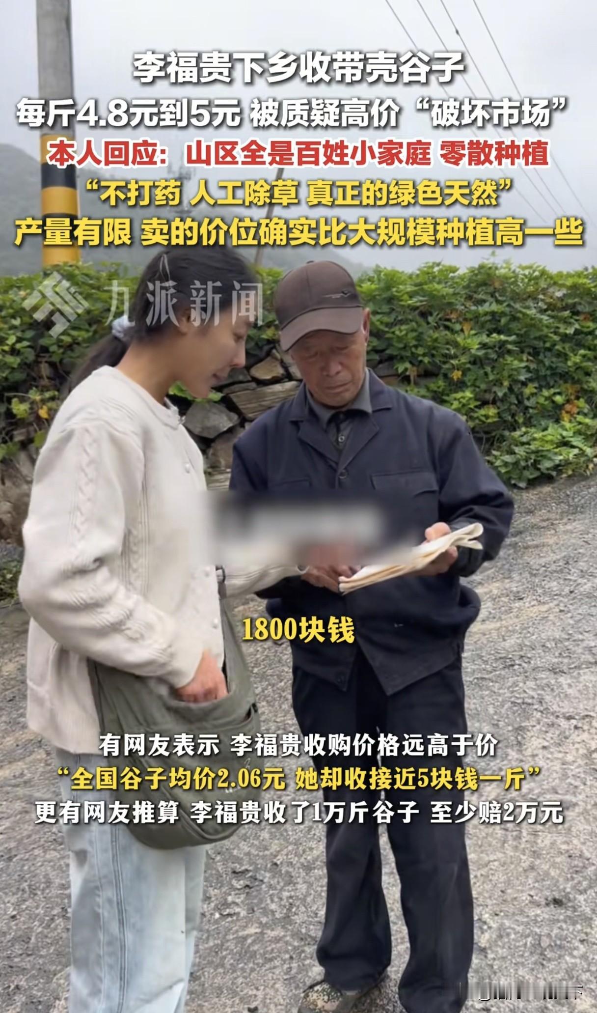 河南新乡,网红李富贵抬高价格5元一斤收谷子扰乱市场? 还是说在作秀俺流量?还是为了让谷子卖出更好的价格?网上有不同的声音出现。 近日,网红李富贵用4.8元至5元一斤的价格到村里面收谷子,这个价格确实比市面的收购价要高一些,所以就被一些网友吐槽在作秀、故意抬高价格获取流量,更有甚者是在破坏谷子的收购市场…… 网红李富贵还对此事做了专门的回应:这些扁山去的小米售价都在七八元一斤,零售价也在五元一斤左右,她4.8元一斤收也是低于零售价,是按照正常售价去收购的,所以没有抬价。 据了解,此次的网红李富贵收购行为,是为了帮一家粮农公司收购的,不是她自己收购的。 有网友表示: 有流量,赚的钱更多,对她来说带壳的5元不贵,小投资,赚大钱,还赚好名声。 有网友表示: 发视频说收购价为五块钱一斤,就是为了以后在网上卖高价而做的营销。收点做做样子而已,无公害不是说说而已,要有资质。 也有网友表示: 有没有一个可能,市场和中间商一直以来都在削剥农民,李福贵这5元一斤才是对的 ? 还有网友表示: 不是说什么真诚,大家懂不懂市场,都是这些为了整活,效果,网红效益,就像现在有些主播一晚上倒贴200万出去,但其他方面都在回流,抓鱼对赌主播甚至一些拍人间冷暖的主播,但都是互利互惠的事,长远来看不是好事。 不知道大家对此事怎么看?欢迎留言一起探讨交流。 李富贵 李富贵高价收谷子