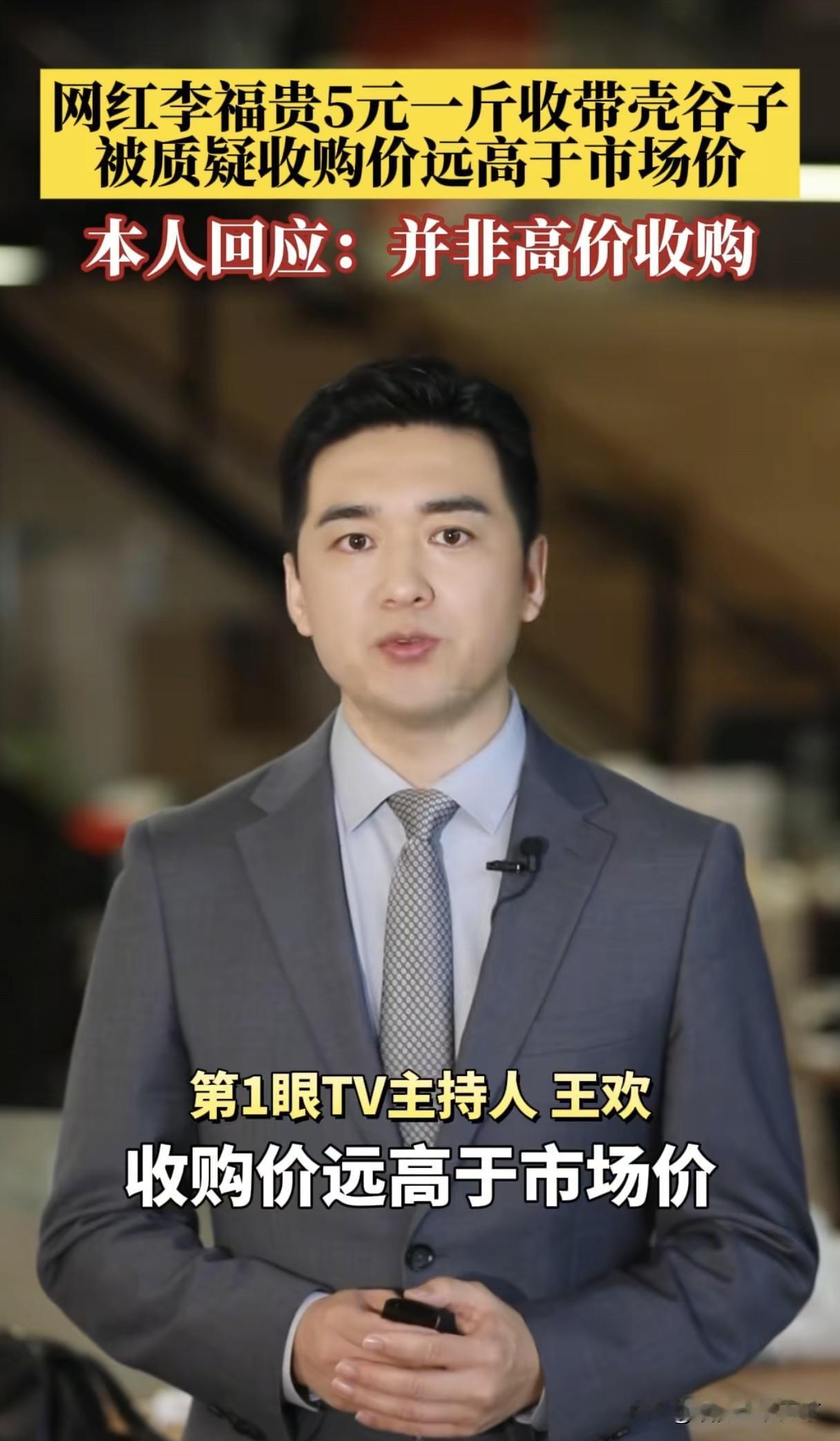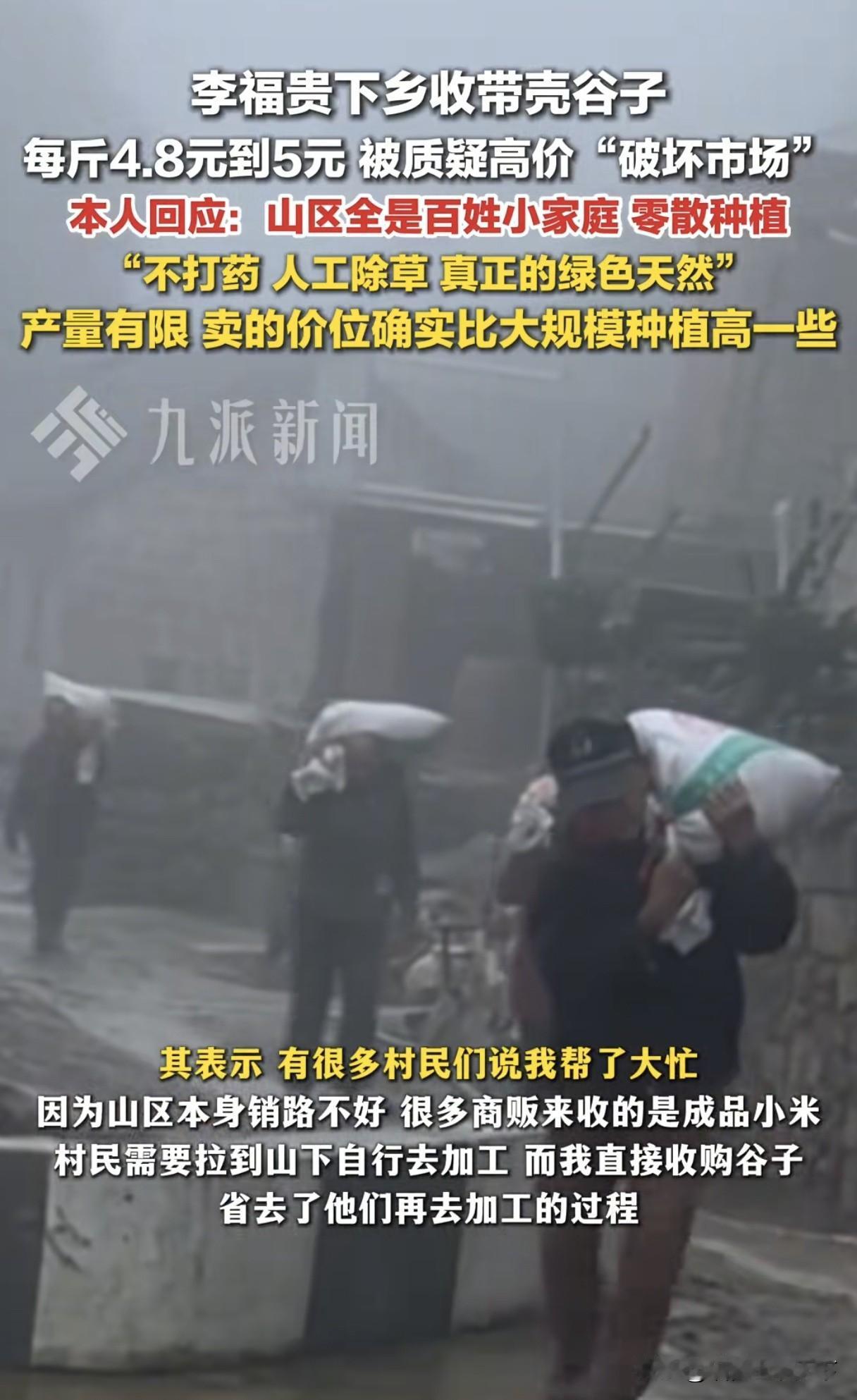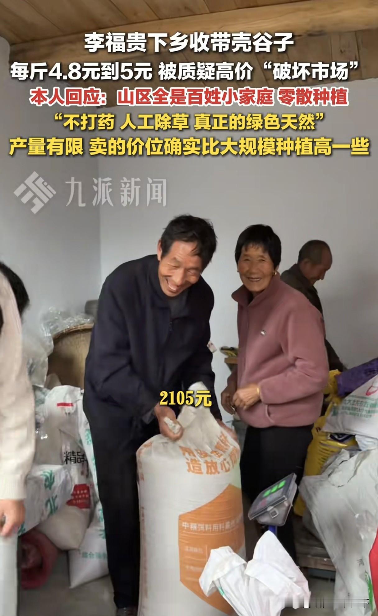 河南新乡,网红李富贵抬高价格5元一斤收谷子扰乱市场? 还是说在作秀俺流量?还是为了让谷子卖出更好的价格?网上有不同的声音出现。 近日,网红李富贵用4.8元至5元一斤的价格到村里面收谷子,这个价格确实比市面的收购价要高一些,所以就被一些网友吐槽在作秀、故意抬高价格获取流量,更有甚者是在破坏谷子的收购市场…… 网红李富贵还对此事做了专门的回应:这些扁山去的小米售价都在七八元一斤,零售价也在五元一斤左右,她4.8元一斤收也是低于零售价,是按照正常售价去收购的,所以没有抬价。 据了解,此次的网红李富贵收购行为,是为了帮一家粮农公司收购的,不是她自己收购的。 有网友表示: 有流量,赚的钱更多,对她来说带壳的5元不贵,小投资,赚大钱,还赚好名声。 有网友表示: 发视频说收购价为五块钱一斤,就是为了以后在网上卖高价而做的营销。收点做做样子而已,无公害不是说说而已,要有资质。 也有网友表示: 有没有一个可能,市场和中间商一直以来都在削剥农民,李福贵这5元一斤才是对的 ? 还有网友表示: 不是说什么真诚,大家懂不懂市场,都是这些为了整活,效果,网红效益,就像现在有些主播一晚上倒贴200万出去,但其他方面都在回流,抓鱼对赌主播甚至一些拍人间冷暖的主播,但都是互利互惠的事,长远来看不是好事。 不知道大家对此事怎么看?欢迎留言一起探讨交流。 李富贵 李富贵高价收谷子