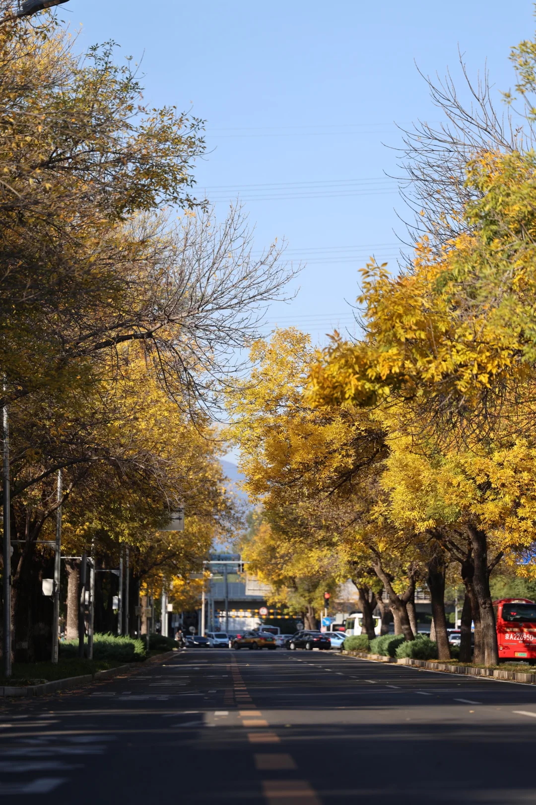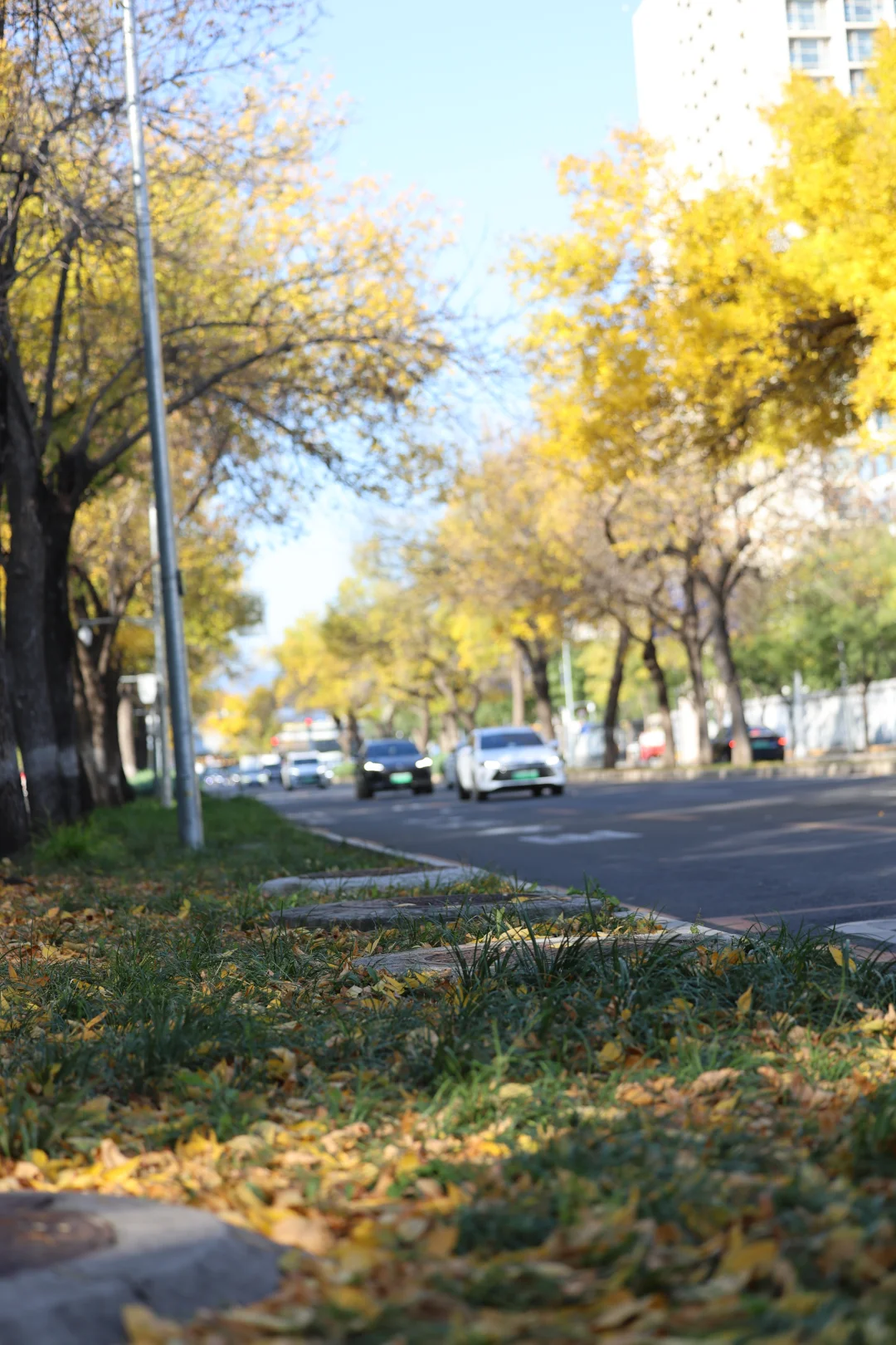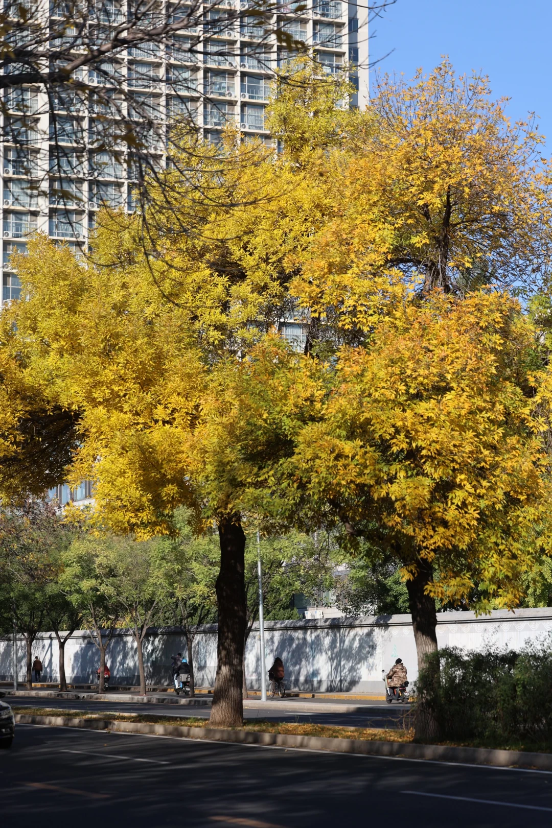 如果是想拍氛围感。拍局部几颗树,那这周还能找到一些地方。不少小的白蜡树,晒不到太阳的,会掉得慢一些。