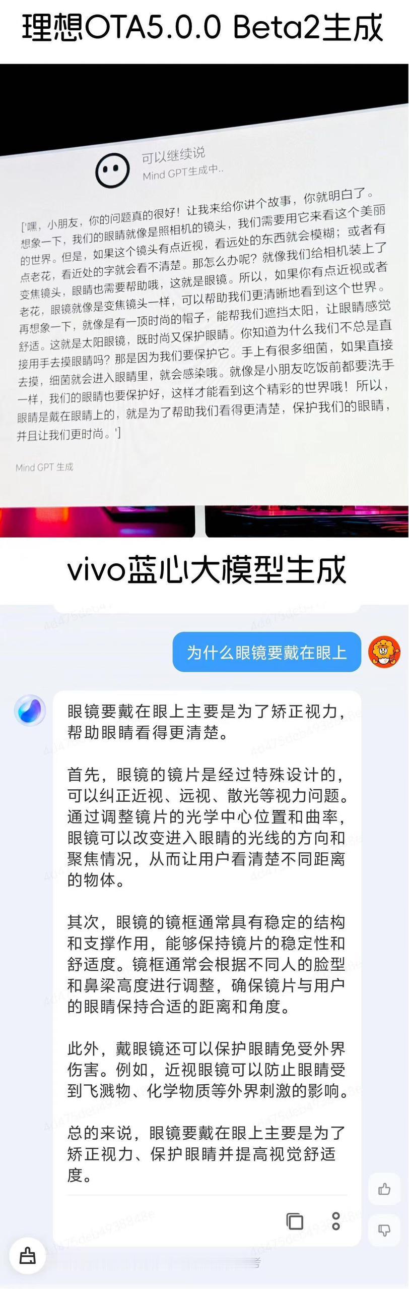 理想汽车OTA5.0 Beta详细体验,大模型上车,Mind GPT、代客泊车、高速NOA以及全球能用的LCC。 📌座舱5.0-Mind GPT从能用到好用 5.0 Beta3可能最出圈的就是Mind GPT,理想同学拥有了像人类一样的自由对话能力。比如日常对我家来说,理想同学Mind GPT真正解决了“十万个为什么”的解答问题,孩子问的问题呀真挺难回答的,现在好了理想同学回答的比我好。比如“树为什么长在地上”“为什么眼镜要戴在眼睛上”。这些个问题,也用vivo 蓝心大模型问了,理想同学的回答明显更懂孩子真正在问什么,不仅仅是罗列论据,更像一个人。之前的版本里也有《十万个为什么》的资源授权,但必须得问那些特定的问题,孩子很难真正用起来,就是“能用”和“好用”的区别,现在是好用,随便问。还支持英文对话,你看理想Mind GPT对于巴菲特的理解肯定是超过了百度百科的。 还有就是他对于有效指令的识别成功率更高,并且知道什么时候该退下。之前,我们说完指令再聊天很容易又激发理想同学,比如说我们说完导航到某个地方,然后我们车上人瞎聊天,突然他听到某个词就直接给我们改了原本的导航目的地,这个就很难受,以至于我们经常会让他“退下吧”。OTA5.0的理想同学“更知进退”了,就是说我们说的废话,我们聊天的内容,它会自动的去过滤。 以理想L9为例,这款家庭六座旗舰SUV,还可以让理想同学“画一个赛博朋克的机甲战士”,“一辆理想L9改装的跑车”,“一辆理想L9在天上飞”...每天画30张。横向比较也是很牛的,有Midjourney那意思,比vivo蓝心大模型画的更像“人画的”。 📌座舱5.0-UI与网页 这次车机变化,取消了L型,其实这个背后的逻辑我是有感触的,就是说日常很少点最左侧竖行的这些按钮,都会习惯按底下这一行,适应起来很快。 UI设计理念应该是“离驾驶员更近的地方固定放置跟驾驶安全相关的内容”,比如默认是把BEV视觉、导航地图固定在最左侧,底部则是音乐播放,可以看动图,模块的滑动很丝滑。 说到音乐,就是期待已久的Apple Music终于在理想上落地了。落地的方式是网页端,所以我爱人在追的《以爱为营》的芒果TV也可以看了。好处是登录账号后会保留,下次上次就不用了,喊理想同学就能打开Apple Music。音质高,原唱曲库尤其是英文歌特别多,也能调动车上立体声,空间音效还不太行。这样就解决了,iPhone音乐用户要买双份会员的问题。 📌AD Max3.0-Killer级的泊车 视频胜千言,点开看下我这个第一视角的地库停车就能感受到了。。我们家固定车位走几天就学会了,自己开到车位附近,自己停到车位上。对比之前的版本强太多了!对我来说是killer级别的,前进后退档位的切换很快,还能“离车泊入”,就是人下车它自己开到停车位上,这样就可以节省时间了。“代客泊车”背后的逻辑跟通勤NOA有点儿相似,就是这条路线走上很多次它就可以自主训练学会。甚至在车友群里看过那种非常难停的边角车位,这套5.0 Beta3版依旧可以。科目二倒车入库有阴影的同学,得来个大感谢。 📌AD Max3.0-全场景NOA和全场景辅助驾驶LCC 高速上的感受是进匝道更精准了,速度也不会一下降低太多,会保持较高的过弯速度,大曲率弯也能handle。结合LCC会发现对于路上划线不清楚的理解更好,100m左右的无划线路口也能过,识别红绿灯颜色起步刹车很智能。这次升级感触最强烈的其实是绕行能力加强了,不管是高速上施工桩桶还是城市路段插入的车辆,都可以做到比较稳定且准确地绕行。拥挤路段的博弈还是不太行,这个得期待后续的表现了。 还有,现在EID环境感知界面上,能看到的交通参与者更多了,可以用视觉实时看到路线。比如说在学校里面的路,也能用LCC来开,也能看到园区40km/h的限速牌。 一个小细节,它的前进方向上有个蓝色的路线规划,倒车就向后画,这个是能给到驾驶者信心的,可以提前判定它的行进会不会有危险。再比如侧面的工程车,就是用到了异物判定机制,把它长宽都显示在车机上,横穿马路的人和两轮车也都有。对,AEB还针对两轮车和三轮车🛺斜向侵入做了优化。 📌这一波理想5.0的OTA真的是把牙膏挤爆那种,非常值得推荐升级,体验Killer级的代客泊车,像人一样的理想同学Mind GPT。AI生成式画画让孩子早一步接触大模型,也解救了我回答不了十万个为什么的难题😅刚儿子问我“爸爸,理想同学是不是有手呀”