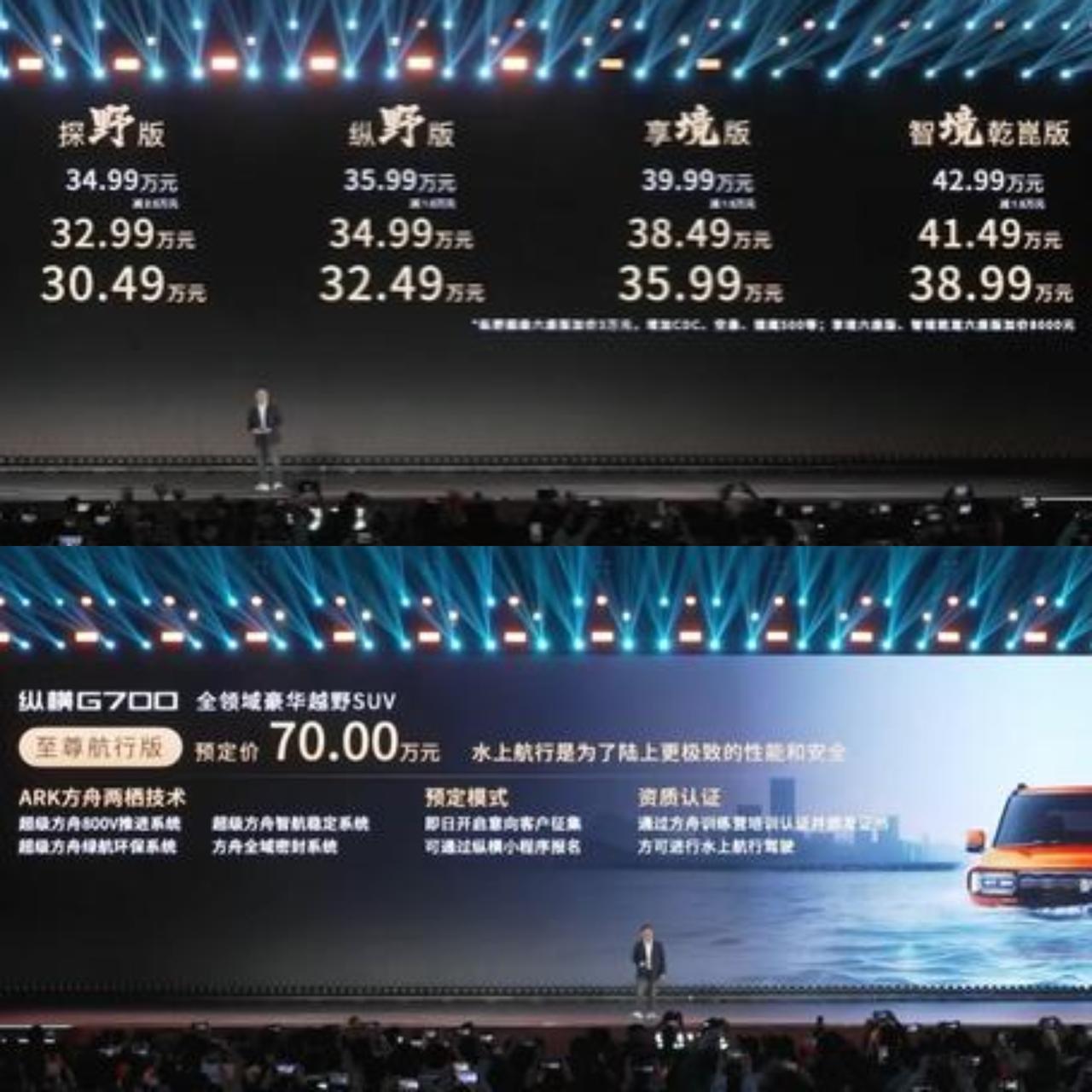 奇瑞没走成的高端被捷途走了,奇瑞推出的高端品牌星途目前是一蹶不振,不管是油车还是电车奇瑞20万以下卖的很好,超过20万基本上就是无人问津。这次直接跨越20万,迈向了30万的价格,我觉得这一步很好,因为30多万要的是舒适度,要的是特立独行,要的是配置高。 首先一点捷途方盒子造型已经打开了市场,这次捷途纵横G700依然是方盒子造型,而且5198*2050*1956毫米的车身尺寸,十分魁梧的造型设计,但是却用了一个2870毫米的轴距,而且有6座版本可以选择,超过5米的车身基本都是2900毫米以上的轴距,甚至3米,别看差这几厘米,车内的空间会差很多。虽然有六座,但是车身尺寸的原因除去备胎也就不到5米的车身尺寸,所以空间并不突出。 其次就是浮水的功能并不是标配,而是选配的,也就是我们在原价的基础上要加钱才能实现,也许标配以后成本会增加,价格也会增加吧,在没有浮水功能以后它就是一个配置超高的越野车。 【特点】 1️⃣其实捷途纵横G700最厉害的一点是全车IP68级的防水,即使真的涉水了也可以浮起来,完全不怕我们的车子成为泡水车。 捷途纵横G700浮水功能不仅带有推进器,还有陀螺仪保证车子的稳定性,这也算是一次升级吧。 2️⃣还有制氧机在车内,可以一直制造氧气,让人开车的时候保持清醒。 3️⃣动力方面虽然是解耦四驱,但是它是3个电机,即使在亏电情况下,也可以做到一个电机发电,两个电机驱动。而且有前后两把差速锁,不仅可以在沙漠里面奔跑,还能进行硬派越野,再加上100升的大油箱,续航里程超过1000公里,在远途穿越的时候也不用担心续航里程了。 【购车对比】 捷途纵横G700把友商的特点都给抓过来啦,首先就是仰望U8的浮水,其次是方程豹的无人机,智驾系统也有华为乾崑智驾4.0系统,这属于没有短版的水桶车。 价格方面普通班本只要32.99到42.29万,主要竞争对手还是坦克500系列与方程豹8,在最后的配置与舒适度还有动力面前,还是有一定的竞争力。但是至尊航行版要70万起售,这捷途的品牌价值貌似无法撑起这么高的价格。 虽然捷途纵横G700各种性能与配置拉满了,但是方盒子造型的车型终归不会是主流车型,所以销量也不会很高,毕竟车子再好,也许要被认可,捷途貌似无法撑起这么高的价格,顶多属于拉高品牌价值的车子。 【总结】 捷途纵横G700动力好,配置高,舒适度也好,安全性更没的说,缺乏的还是品牌的认可,一个卖十几万的品牌,忽然翻了一倍或者几倍,卖30万甚至70,我觉得这就是穷人买不起,富人看不上的车子,毕竟有钱人要的是排面,不可能买一个几十万的车子却与十几万的车子一样的牌子,这就是仰望系列成功的原因。【来自懂车帝车友圈】