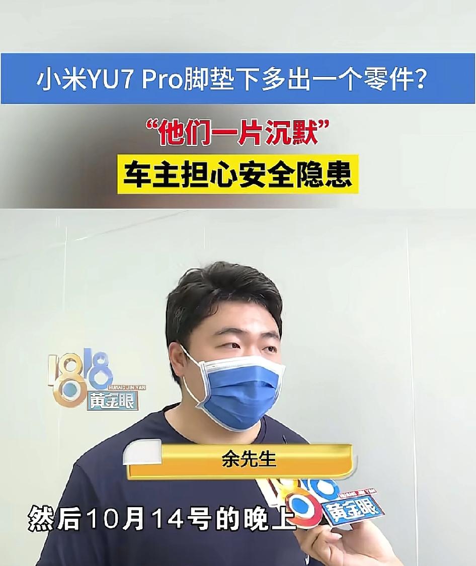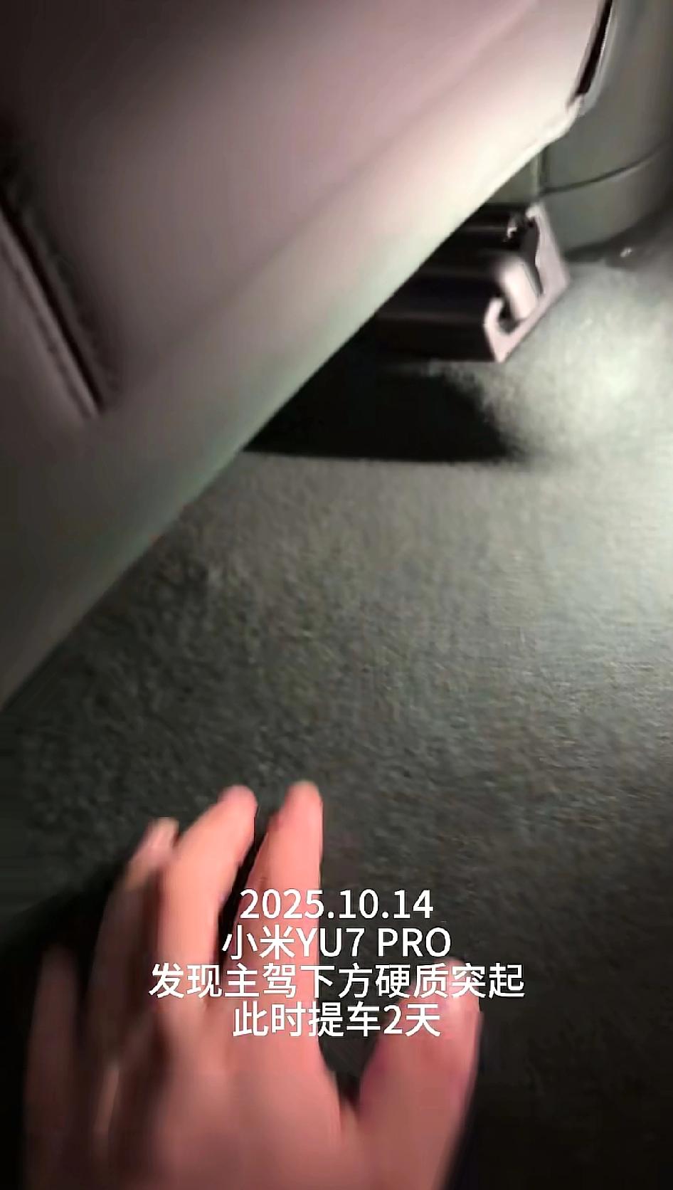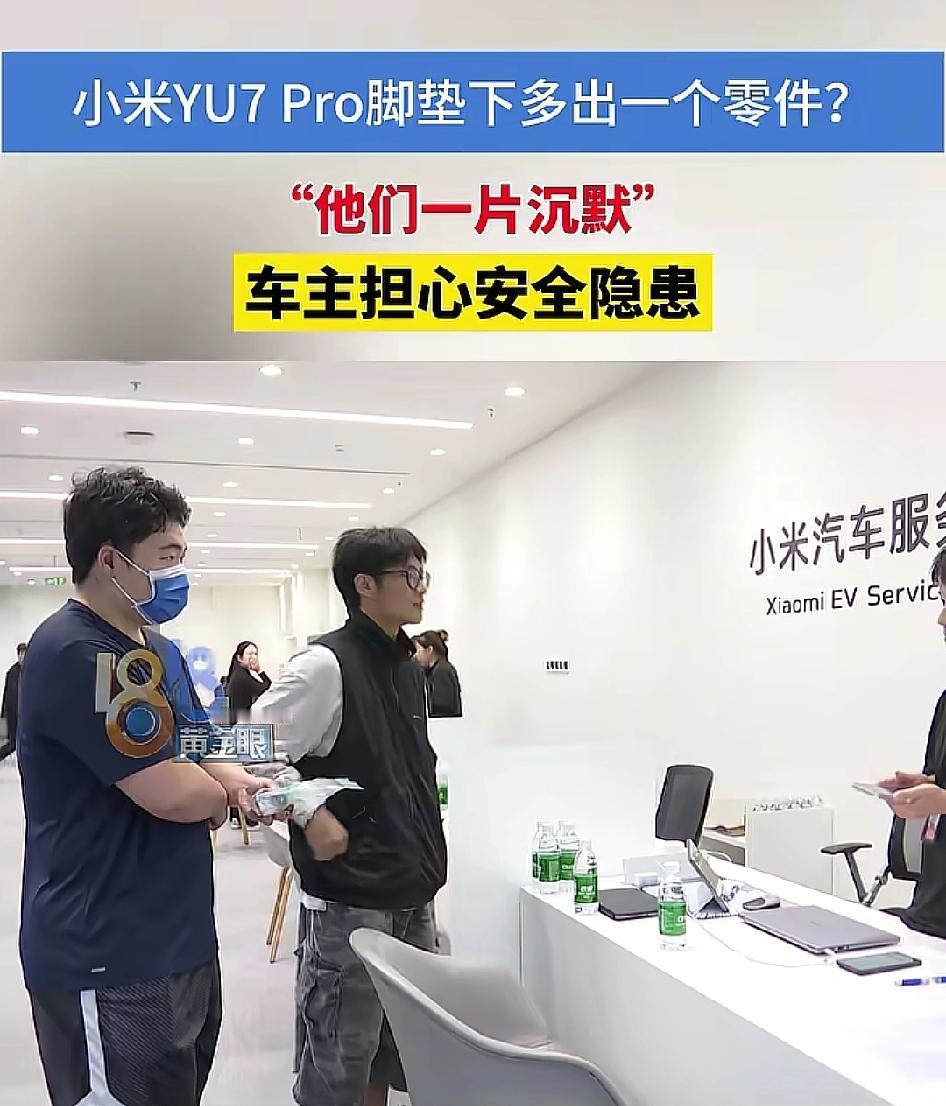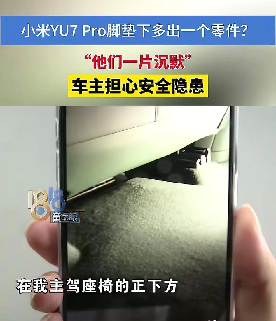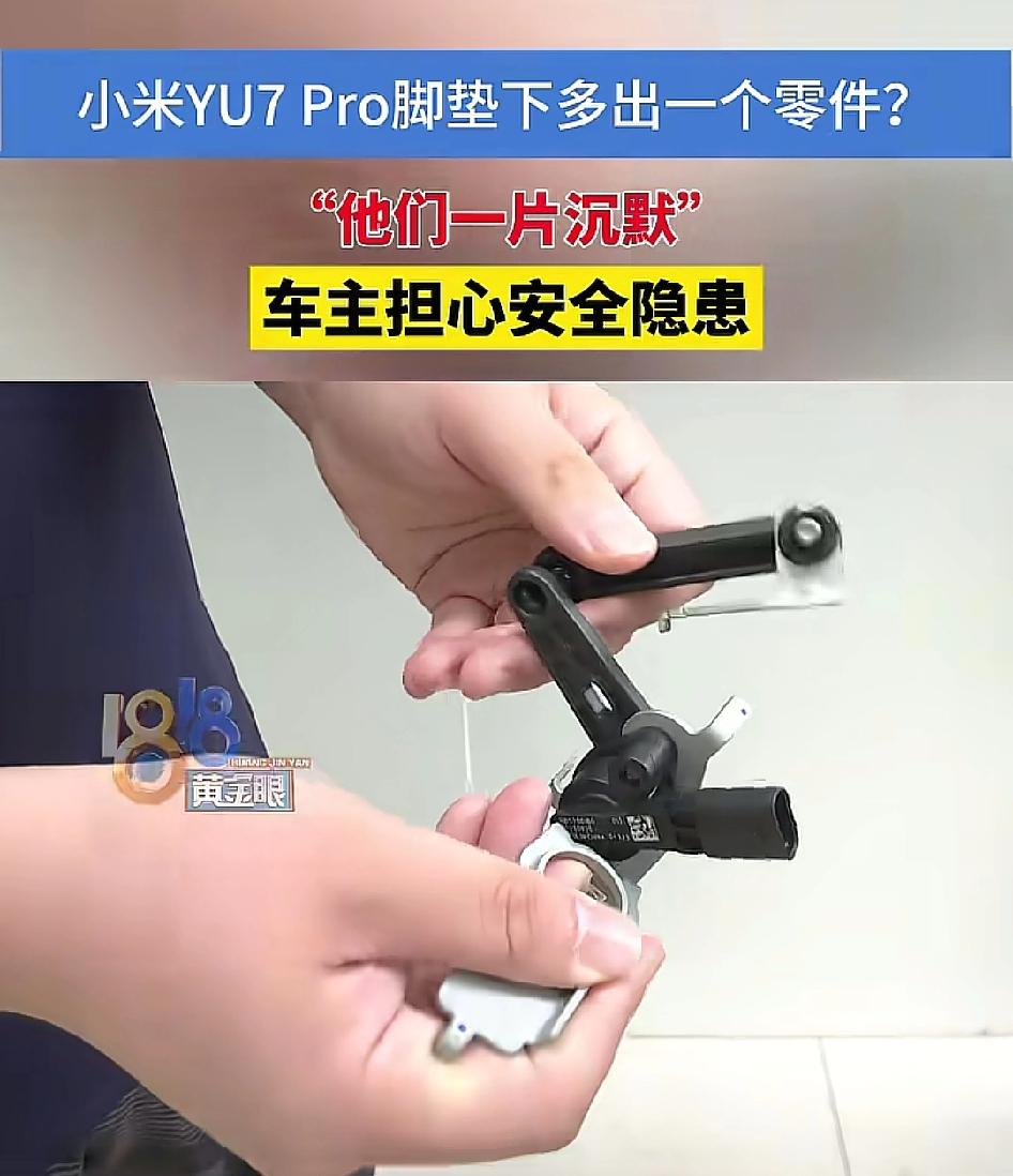 刚提几天的小米YU7 Pro 脚垫下多出一个零件?车主担心安全隐患,客服回复取出来就行了,4S店没有做出回应沉默应对。 我觉得这不是车企该有的态度,车上多出一个零件,这辆车没质检出来还过审了,那是不是同一批次车型的另一辆少装了这个零件,不得不让人怀疑!首先它是一辆车,关乎生命安全,不应该冷漠处理,网友质疑声那么高,就是不积极推进售后,总搞一些顾面子不顾里子的事!