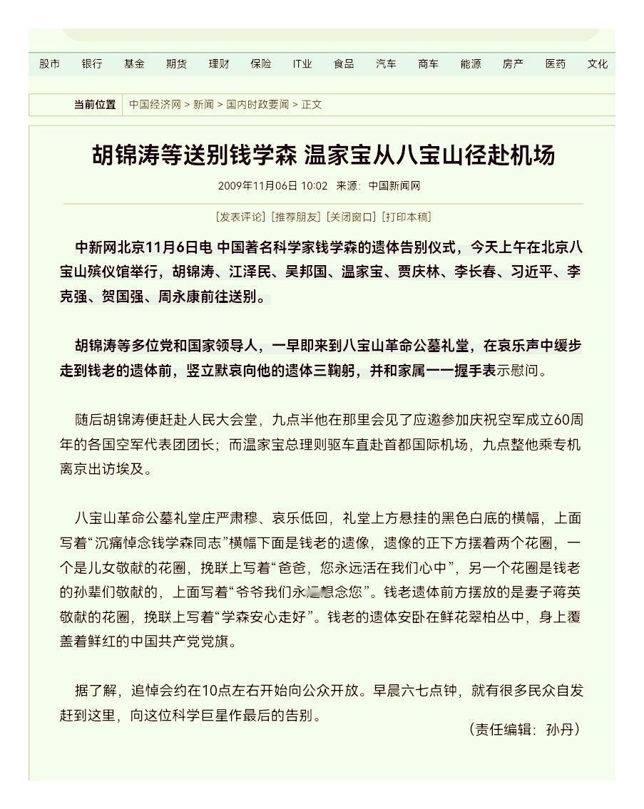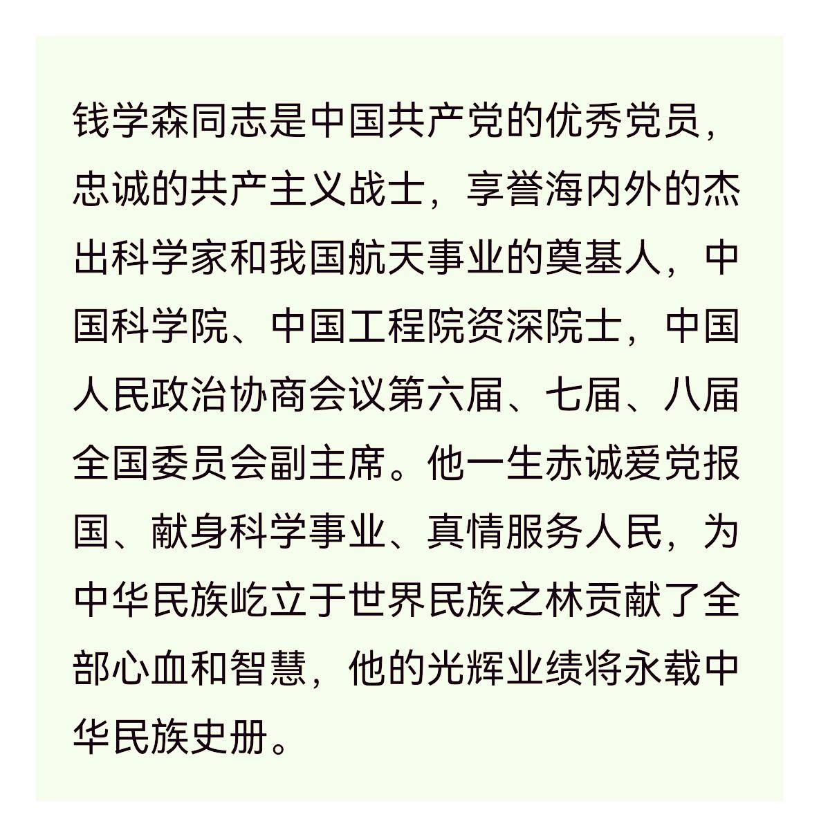 钱学森先生一生荣耀,几人能及? 钱学森先生在世的时候,几代伟人都与其有交往,包括接见、探望和请吃饭等等。这是莫大的荣耀! 钱学森先生政治上攀顶全国政协副主席,步入党和国家领导人行列;学术上为两院院士、“两弹一星”元勋,可谓政治、学术双巅峰,难以企及! 钱学森先生逝世后,党和国家最高领导人悉数前往八宝山送别,这是何等的荣耀! 钱学森先生诞辰100周年,官方纪念时评价甚高,“赤诚爱党报国、献生科学事业、真情服务人民”这十八个字的高度评价,可以说是一种空谷幽兰的绝响,唯有钱老有资格被这样褒奖! 钱学森先生,是广大知识分子爱党、爱国、爱人民的楷模,是引领中华民族伟大复兴的“两弹一星”(一颗中国心,双肩担责任,双手担落实)!