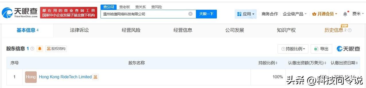 【哈啰出行在温州成立网络科技公司 注册资本500万美元】 天眼查App显示,近日,温州哈捷网络科技有限公司成立,法定代表人为邢成,注册资本500万美元,经营范围包括网络技术服务、机械设备租赁、共享自行车服务等。股东信息显示,该公司由哈啰出行旗下Hong Kong RideTech Limited全资持股。 天眼查信息: