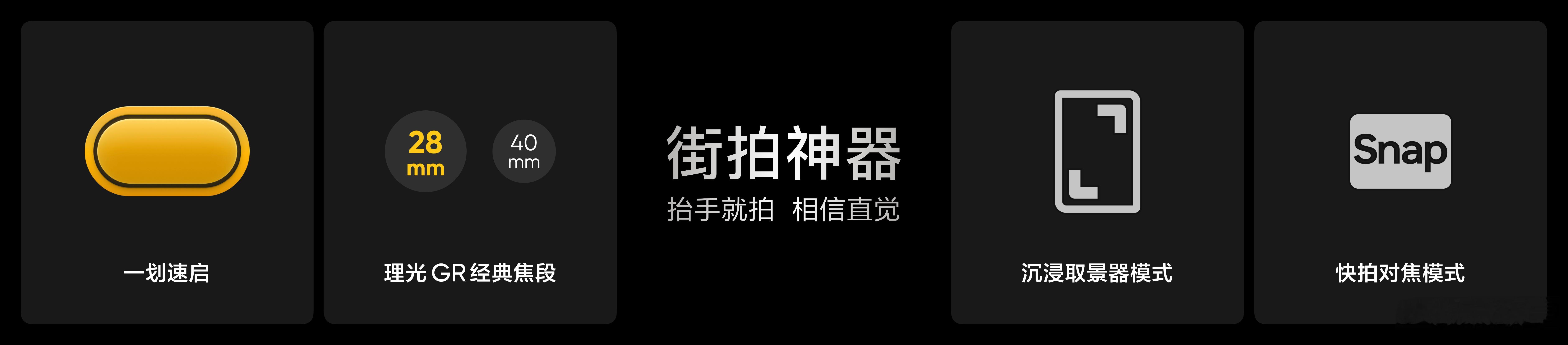 -一划速启理光GR模式:复刻28mm和40mm理光GR灵魂双焦段,支持快拍对焦模式,沉浸式取景器模式,抬手就拍,相信直觉!