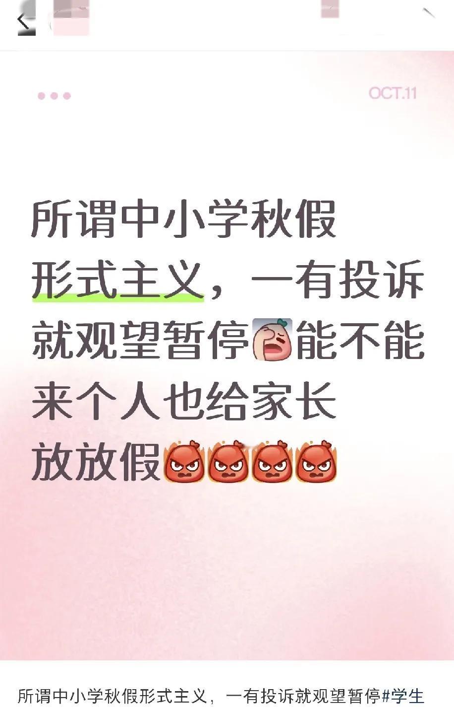 广东多地因春秋假问题引发家长投诉 部分家长直接爆粗口,坚决抵制春秋假 有家长道出心声:不反对放假,但反对老师放假! 主要的矛盾就是,家长认为放假孩子没时间管,只会增添麻烦 要不然就不放,放的话老师不能放! 因为可以让有时间的家长带孩子出去玩,没时间的家长把孩子放学校让老师看着 说白了核心诉求就是:如果放的话,学校就做好应对措施,不能给家长带来负担,否则就别放 大家觉得呢? 春秋假放假 春秋假试点