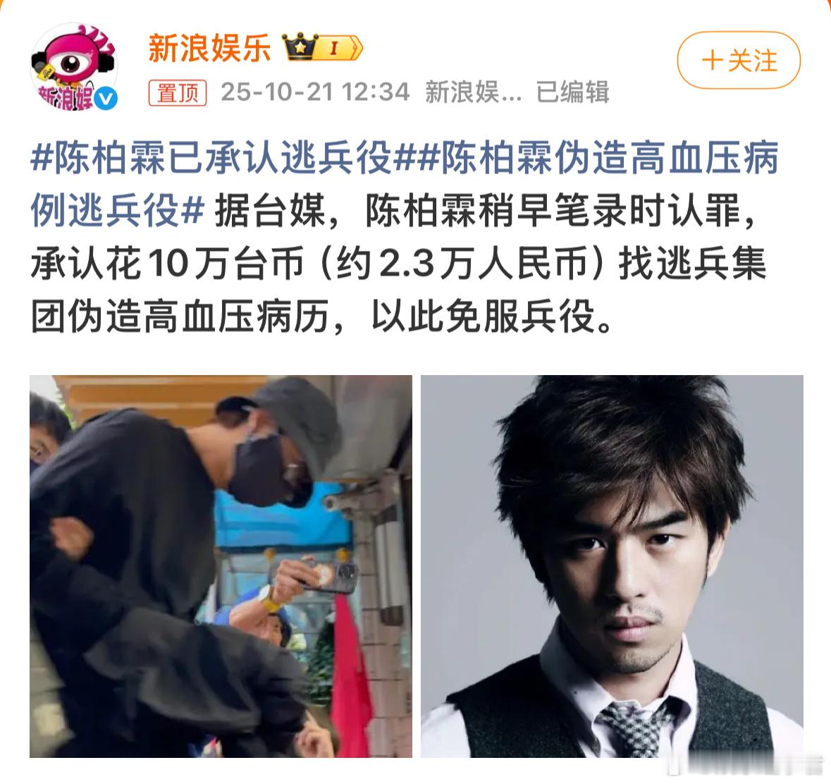 陈柏霖已承认逃兵役陈柏霖在做笔录时,不再挣扎,选择认罪,承认曾花10万台币找“逃兵集团”伪造高血压病例,以此免服兵役。