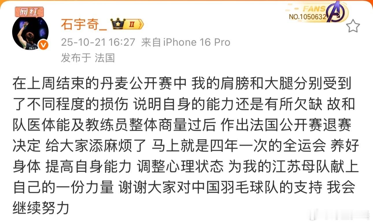 [话筒]发博:在上周结束的丹麦公开赛中 我的肩膀和大腿分别受到了不同程度的损伤 说明自身的能力还是有所欠缺 故和队医体能及教练员整体商量过后 作出法国公开赛退赛决定 给大家添麻烦了 马上就是四年一次的全运会 养好身体 提高自身能力 调整心理状态 为我的江苏母队献上自己的一份力量 谢谢大家对中国羽毛球队的支持 我会继续努力