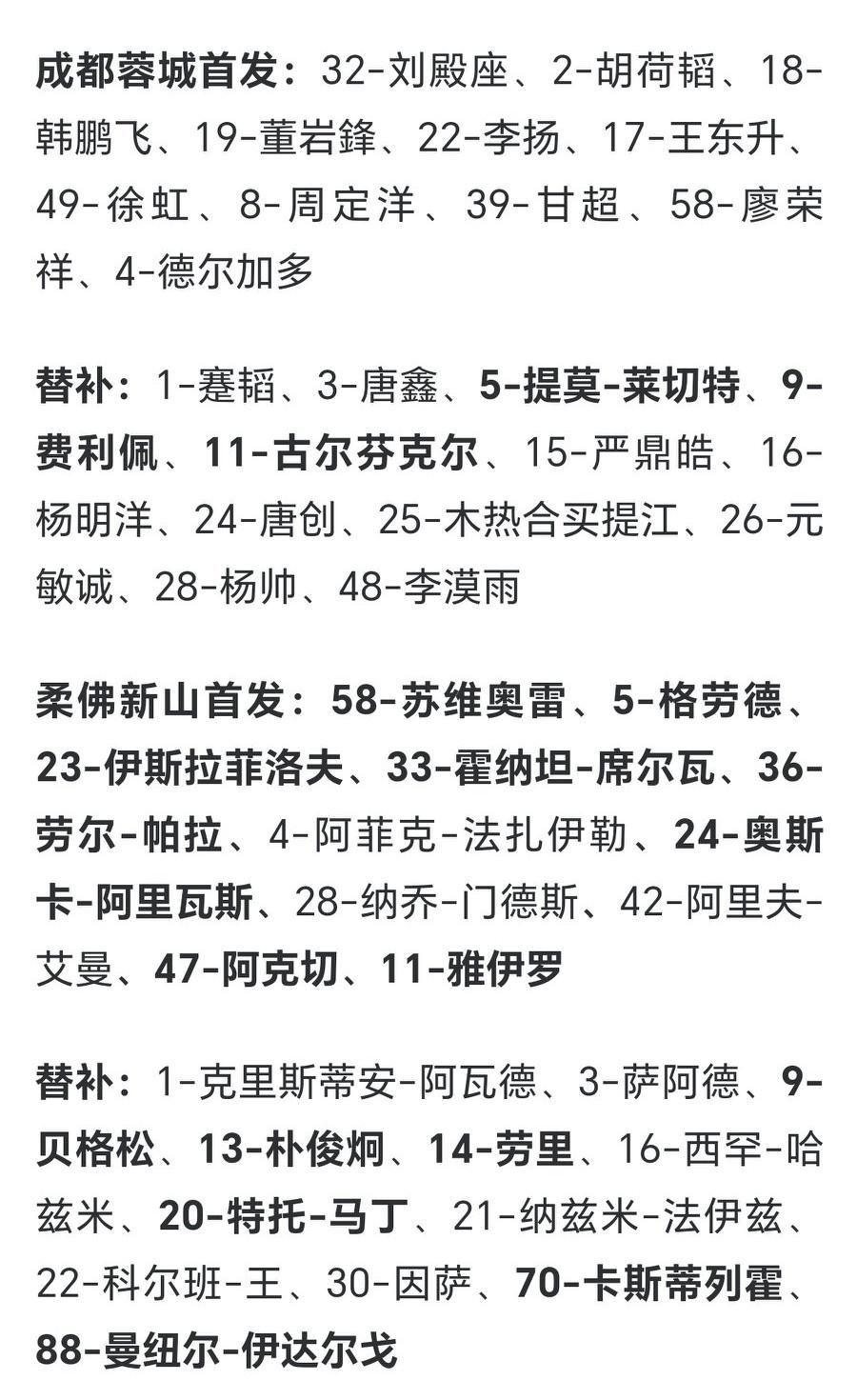 田忌赛马,成都蓉城全华班首发,对阵马来西亚柔佛新山! 我们看到,蓉城外援提莫-莱切特、费利佩和古尔芬克尔都在替补名单,罗慕洛没有进入大名单。 这赛季参加亚冠精英赛的三支中超球队,上海海港、成都蓉城和上海申花,正好又是三支球队争冠,现在已经到白热化,分差在三分内。一场就能影响排名变化,而且联赛就剩三场。 估计三支球队都会以替补出战亚冠,不知道中国足协和亚足联看到这个场景,有如何感想!成都蓉城
