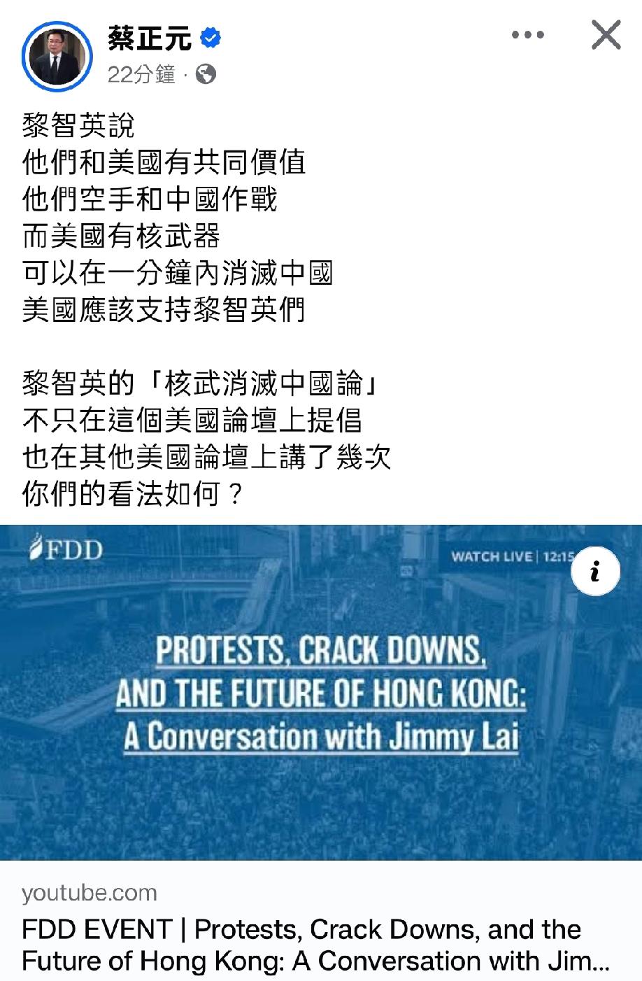 蔡正元教授公开了黎智英的恶臭行径 这类恶臭媒体的畸形产物,啥都不是,只会不停在互联网和媒体上蹦哒,企图影响两岸的共同进步与友好。 郑丽文带领的战斗蓝,想要和自己隔着海的兄弟友好对话,争取布局2028。 台湾想要利好,想要和平统一,应先交出黎智英这类玩弄媒体制造舆论的毒瘤,取消其居住资格,将其驱逐出境。 台湾现状 两岸统一时间表 中国台湾问题