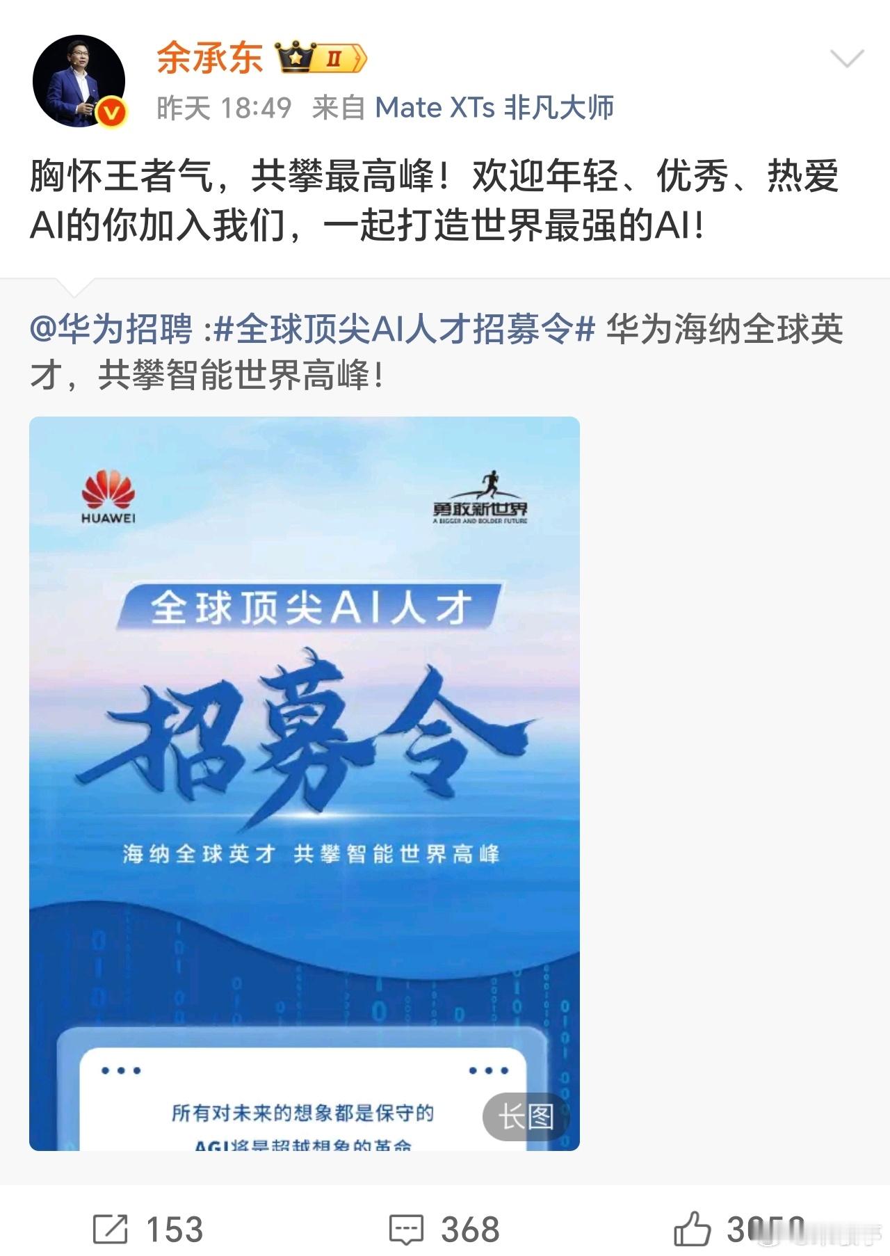 胸怀王者气,共攀最高峰!余总正在主导华为的全球顶尖AI人才招募行动,看来战神余承东这是又要主持、带领华为AI领域崛起了[doge]!